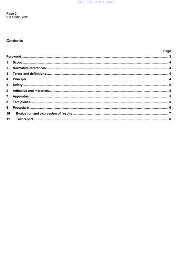 Page 2EN 12961:2001ContentsPageForeword.31Scope.42Normative references.43Terms and definitions.44Principle.45Safety.56Adhesive and materials.57Apparatus.58Test pieces.59Procedure.610Evaluation and expression of results.711Test report.8SIST EN 12961:2002