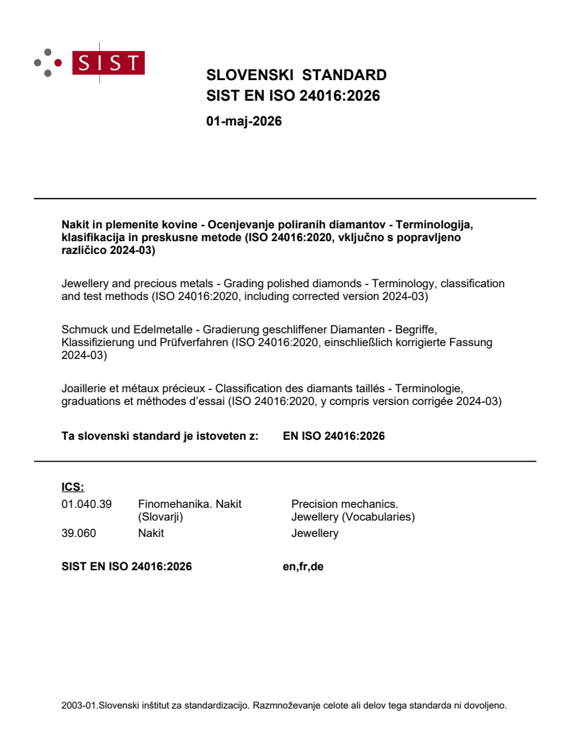 SIST EN ISO 24016:2026 is a standard published by the Slovenian Institute for Standardization (SIST). Its full title is "Jewellery and precious metals - Grading polished diamonds - Terminology, classification and test methods (ISO 24016:2020, including corrected version 2024-03)". This standard covers: This document specifies the terminology, classification and the methods that are used for the grading and description of single unmounted polished diamonds over 0,25 carat (ct). This document applies to natural, unmounted, polished diamonds. It is not to be used for fancy coloured diamonds, synthetic diamonds, treated diamonds (other than is allowed for in 7.4), nor for assembled stones.