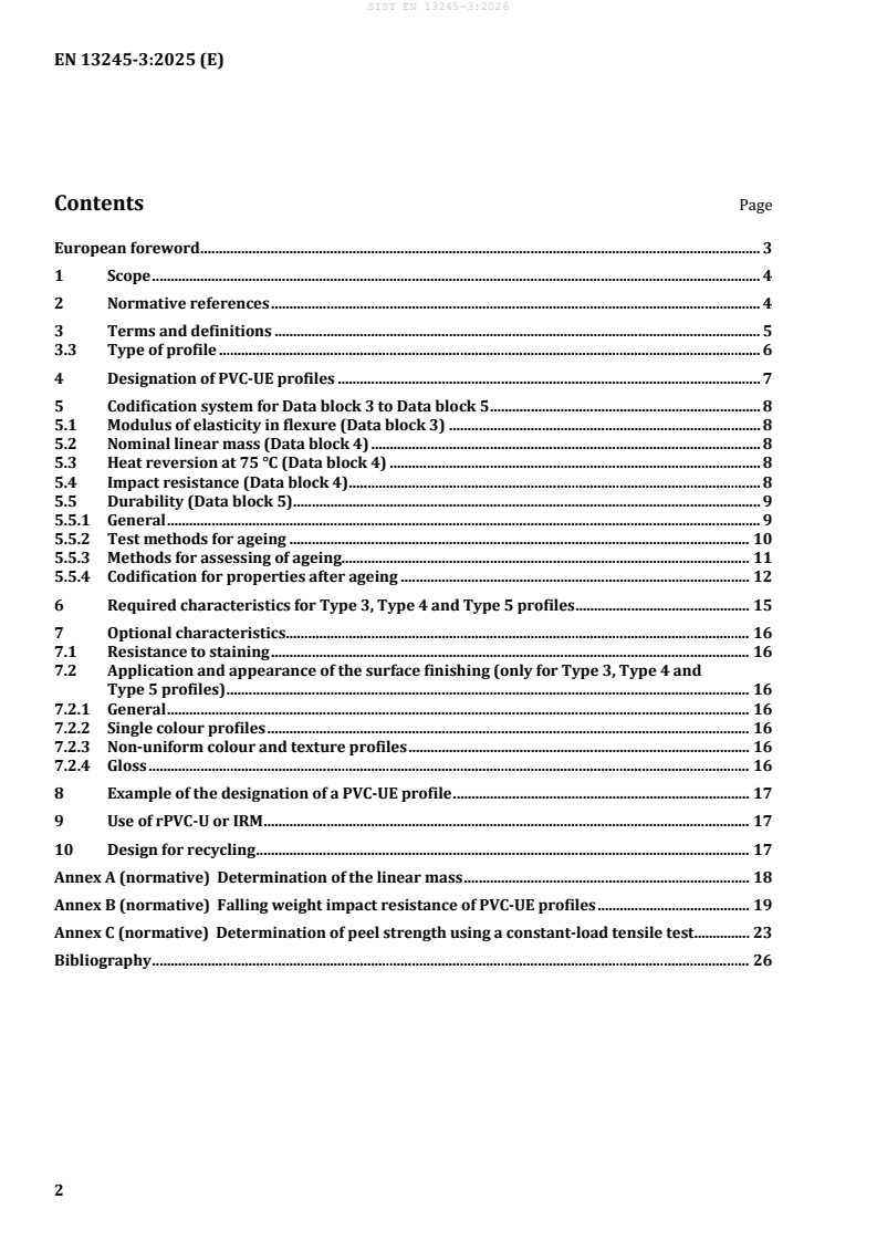 Keywords: EN 13245-3:2025, PVC‑UE profiles, designation system, cellular PVC‑U, surface finishing, heat reversion, impact resistance, durability, product specification.
