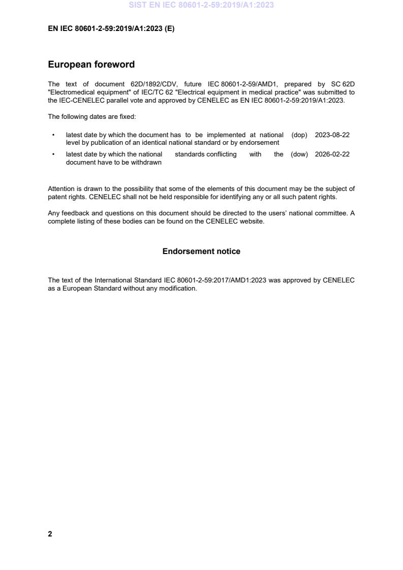 This amendment A1 modifies the European Standard EN IEC 80601-2-59:2019; it was approved by CENELEC on 2023-02-22. CENELEC