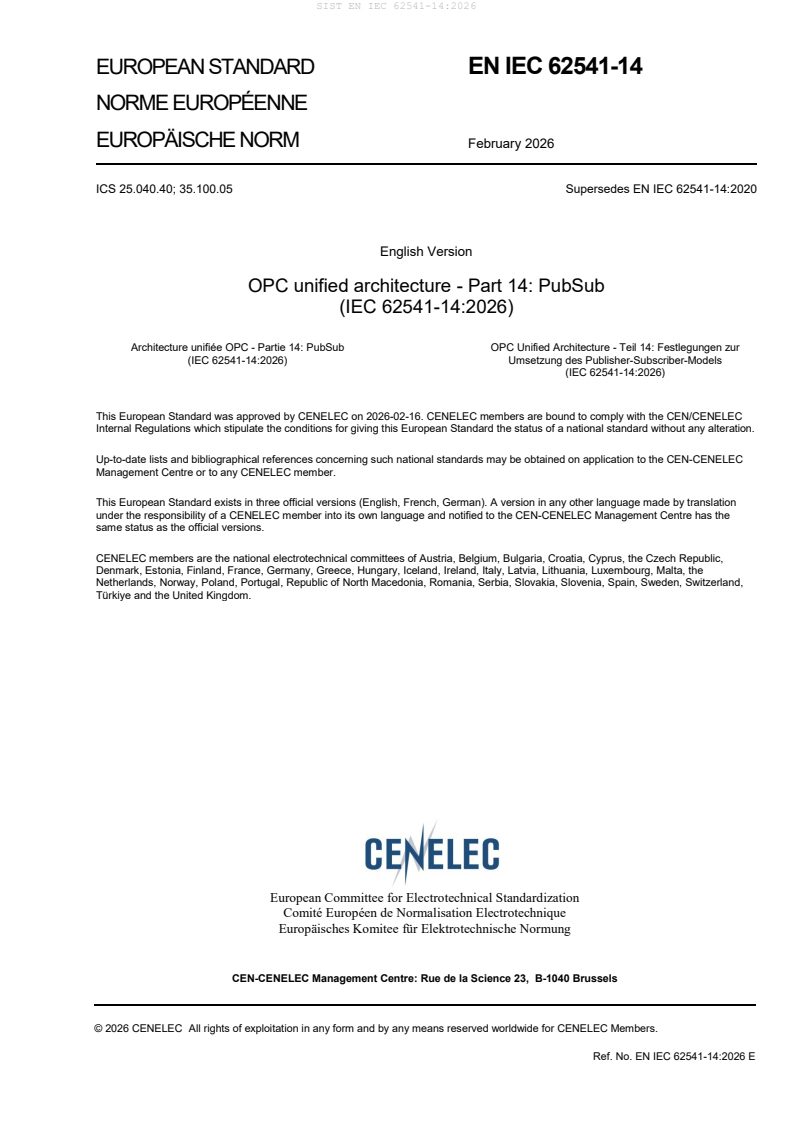 SIST EN IEC 62541-2:2026 - OPC unified architecture - Part 2: Security Model (IEC 62541-2:2026) - Effective Date