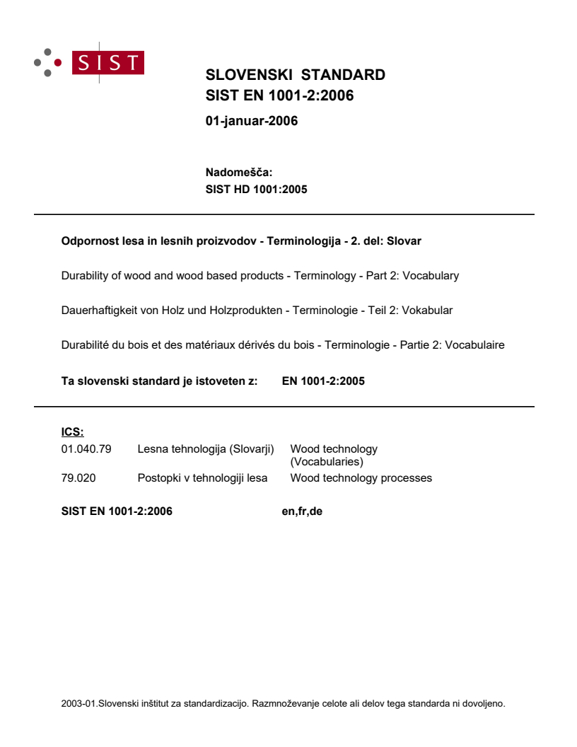 SIST EN 1001-2:2006 is a standard published by the Slovenian Institute for Standardization (SIST). Its full title is "Durability of wood and wood based products - Terminology - Part 2: Vocabulary". This standard covers: This European Standard contains terms relating to wood durability and the definitions of these terms.
