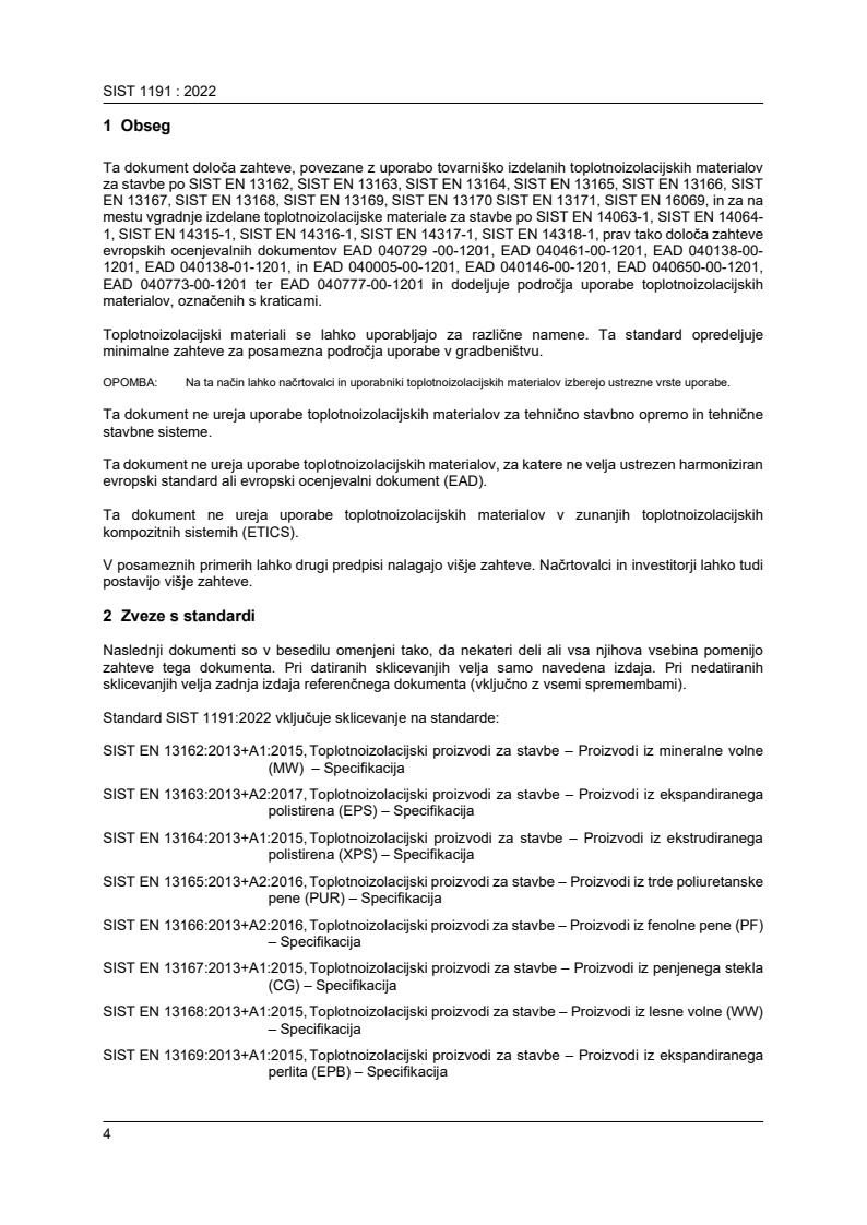 Ta dokument določa zahteve, povezane z uporabo tovarniško izdelanih toplotnoizolacijskih materialov za stavbe po SIST EN 13162, SIST EN 13163, SIST EN 13164, SIST EN 13165, SIST EN 13166, SIST EN 13167, SIST EN 13168, SIST EN 13169, SIST EN 13170 SIST EN 13171, SIST EN 16069, in za na mestu vgradnje izdelane toplotnoizolacijske materiale za stavbe po SIST EN 14063-1, SIST EN 14064- 1, SIST EN 14315-1, SIST EN 14316-1, SIST EN 14317-1, SIST EN 14318-1, prav tako določa zahteve evropskih ocenjevalnih dokumentov EAD 040729 -00-1201, EAD 040461-00-1201, EAD 040138-00- 1201, EAD 040138-01-1201, in EAD 040005-00-1201, EAD 040146-00-1201, EAD 040650-00-1201, EAD 040773-00-1201 ter EAD 040777-00-1201 in dodeljuje področja uporabe toplotnoizolacijskih materialov, označenih s kraticami. Toplotnoizolacijski materiali se lahko uporabljajo za različne namene. Ta standard opredeljuje minimalne zahteve za posamezna področja uporabe v gradbeništvu. OPOMBA: Na ta način lahko načrtovalci in uporabniki toplotnoizolacijskih materialov izberejo ustrezne vrste uporabe. Ta dokument ne ureja uporabe toplotnoizolacijskih materialov za tehnično stavbno opremo in tehnične stavbne sisteme. Ta dokument ne ureja uporabe toplotnoizolacijskih materialov, za katere ne velja ustrezen harmoniziran evropski standard ali evropski ocenjevalni dokument (EAD). Ta dokument ne ureja uporabe toplotnoizolacijskih materialov v zunanjih toplotnoizolacijskih kompozitnih sistemih (ETICS). V posameznih primerih lahko drugi predpisi nalagajo višje zahteve. Načrtovalci in investitorji lahko tudi postavijo višje zahteve.