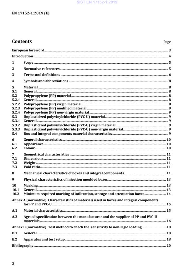 This document gives the definitions and specifies the minimum requirements for injection moulded, extruded and thermoformed thermoplastics cuboid shaped boxes, including integral components, used in underground systems for infiltration, attenuation and storage of non-potable water (e.g. storm water) and manufactured from unplasticized poly(vinyl chloride) (PVC-U) or polypropylene (PP). NOTE 1 Specifications and design rules for systems (water reservoir) are described in part 2 of EN 17152. Product properties are determined by a combination of material specifications, design and manufacturing process. These boxes are intended for buried underground use, e.g. in landscape, pedestrian or vehicular traffic areas. A box can either be factory assembled or site assembled from different components. These boxes are intended to be used as elements in a modular system where the manufacturer has clearly stated in the documentation how the components are assembled to create a complete infiltration, attenuation or storage construction. NOTE 2 Non load bearing component(s) can be manufactured by various methods e.g. extrusion, injection moulding, rotational moulding, thermoforming and low-pressure injection moulding.