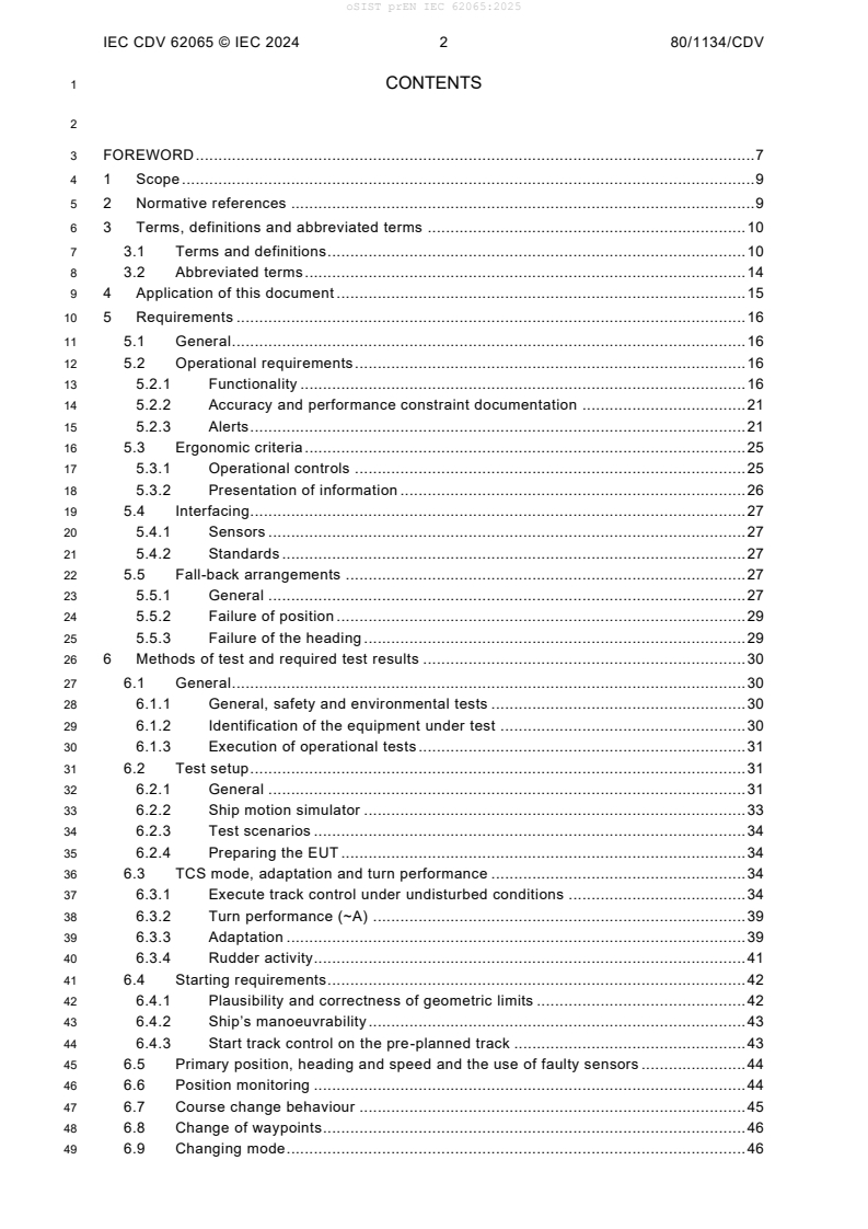 IEC 62065:2025 specifies the minimum operational and performance requirements, test methods and required test results conforming to performance standards adopted by the IMO in resolution MSC.74(69) Annex 2 Recommendation on Performance Standards for Track Control Systems. In addition, it takes into account IMO resolution A.694(17) to which IEC 60945 is associated. It also takes into account IMO resolution MSC.302(87) on bridge alert management (BAM), to which IEC 62923-1 and IEC 62923-2 are associated.