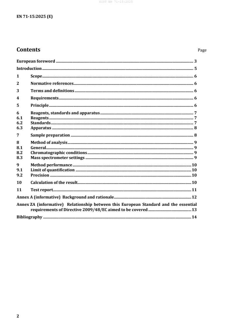 SIST EN 71-15:2025 is a standard published by the Slovenian Institute for Standardization (SIST). Its full title is "Safety of toys - Part 15: Formamide in foam toy materials (content)". This standard covers: This document specifies requirements for formamide in foam toy materials and a test method for determining the content of formamide in foam toy materials. This document is applicable to toys intended for use by children under 36 month or other toys intended to be placed in the mouth. NOTE 1 The document provides a test method to determine if the total content of formamide in foam toy materials is below the 200 mg/kg cut-off limit. Foam toy materials exceeding this limit are subject to the emission limit specified in Appendix C to Annex II to Directive 2009/48/EC. NOTE 2 The European Commission Guidance Document No 11 on the Application of Directive 2009/48/EC on the Safety of Toys [3] provides guidelines to help on the classification of toys intended for children under 36 months of age or of 36 months and over.