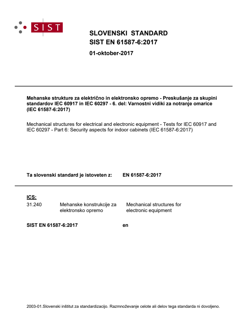 SIST EN 61587-6:2017 is a standard published by the Slovenian Institute for Standardization (SIST). Its full title is "Mechanical structures for electrical and electronic equipment - Tests for IEC 60917 and IEC 60297 - Part 6: Security aspects for indoor cabinets (IEC 61587-6:2017)". This standard covers: IEC 61587-6:2017(E) specifies security aspects and security performance levels of indoor cabinets in accordance with IEC 60917 and IEC 60297. This document intends to clarify the relationship between the installation conditions and the security requirements for indoor cabinets, and to provide the required performances and test methods on mechanical components related with security provisions for indoor cabinets which are in accordance with IEC 60297 series and IEC 60917 series.