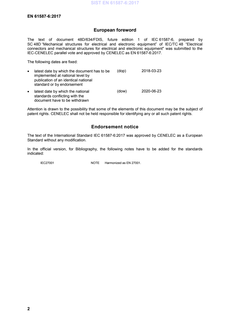 The text of the International Standard IEC 61587-6:2017 was approved by CENELEC as a European