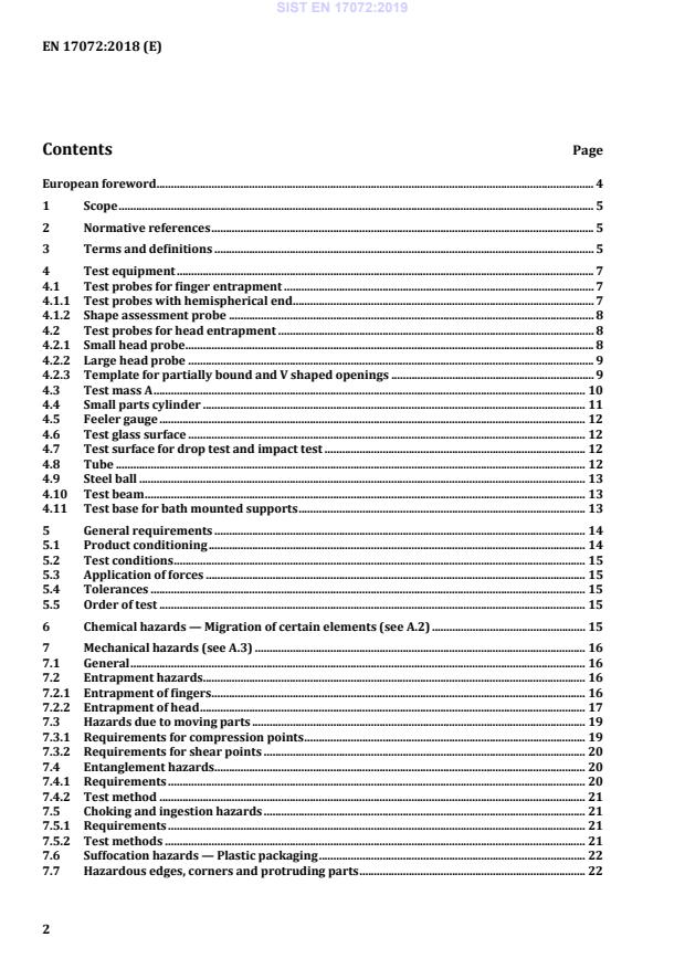 Rationales . 36 A.1 General . 36 A.2 Chemical hazards (see Clause 6) . 36 A.3 Mechanical hazards (see Clause 7) . 36 A.3.1 General . 36 A.3.2 Entrapment hazards . 36 A.3.3 Hazards due to moving parts . 36 A.3.4 Entanglement hazards . 37 A.3.5 Choking and ingestion hazards . 37 A.3.6 Suffocation hazards. 37 A.3.7 Hazardous edges, corners and protruding parts . 37 A.3.8 Hazards from inadequate structural integrity . 37 A.3.9 Hazards due to folding or adjusting of the product . 37 A.3.10 Plastic decals . 38 A.3.11 Hazards due to inadequate stability . 38 A.4 Drowning hazard . 38 A.5 Thermal hazards . 38 Annex B (normative)