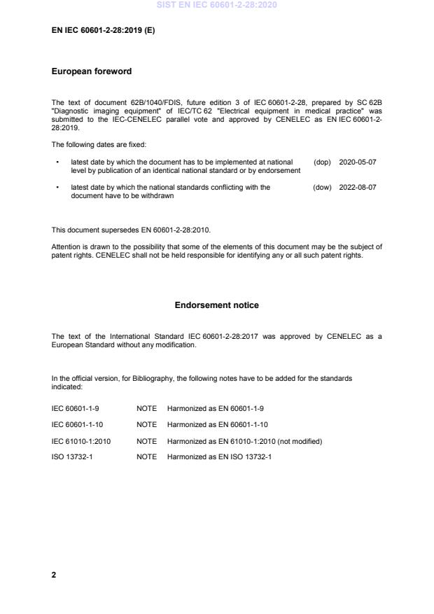 SIST EN IEC 60601-2-28:2020 is a standard published by the Slovenian Institute for Standardization (SIST). Its full title is "Medical electrical equipment - Part 2-28: Particular requirements for the basic safety and essential performance of X-ray tube assemblies for medical diagnosis (IEC 60601-2-28:2017)". This standard covers: IEC 60601-2-28:2010 establishes particular basic safety and essential performance requirements for X-ray tube assemblies for medical diagnosis. This second edition cancels and replaces the first edition published in 1993. This edition constitutes a technical revision. The second edition of this particular standard has been prepared to fit IEC 60601-1:2005 (the third edition of IEC 60601-1), which is referred to as the general standard.