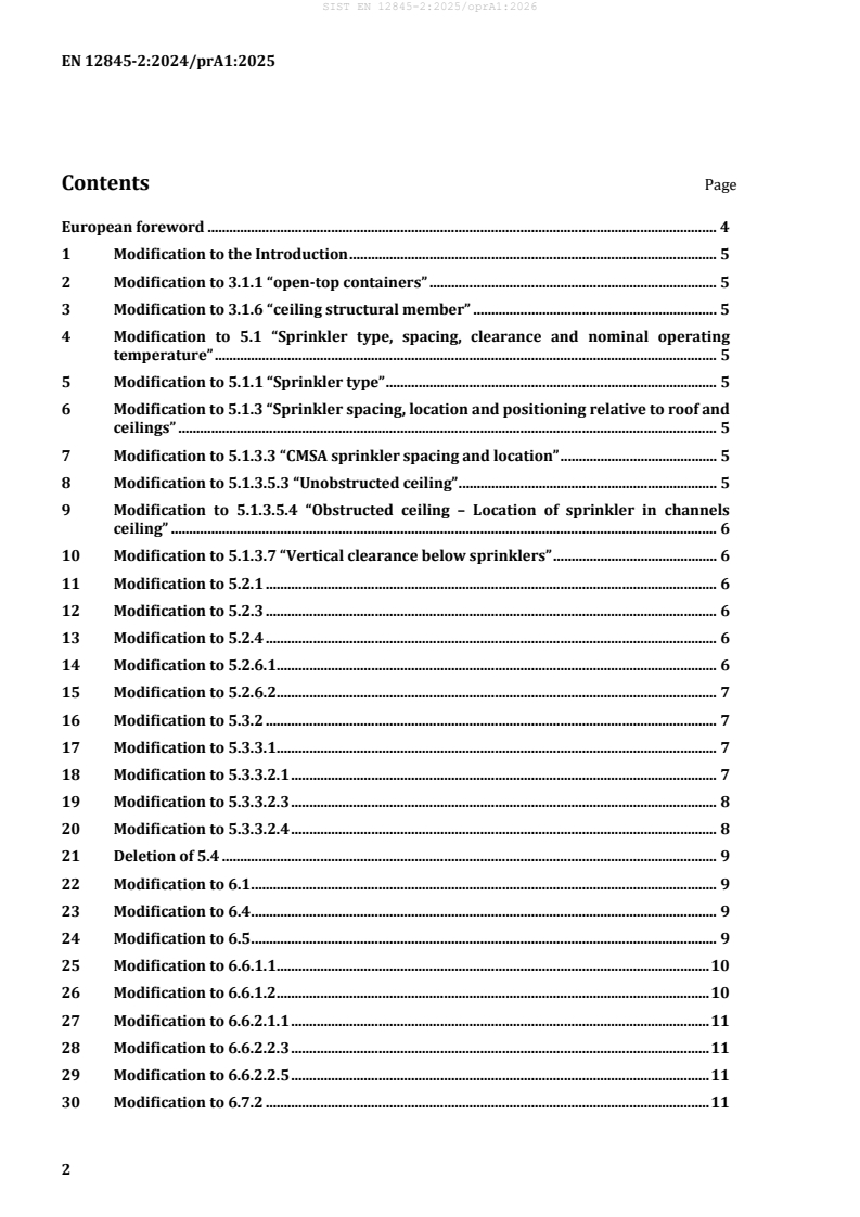 SIST EN 12845-2:2025/oprA1:2026 is a draft amendment to the European standard for fixed firefighting systems, specifically focusing on automatic sprinkler systems. This part 2 of the EN 12845 series addresses the design and installation of Early Suppression Fast Response (ESFR) and Control Mode Specific Application (CMSA) sprinkler systems. Prepared by CEN Technical Committee CEN/TC 191, this standard update integrates recent technical modifications enhancing the applicability, spacing, and installation requirements for ESFR and CMSA sprinklers.