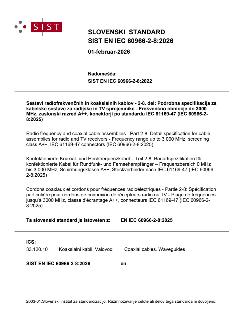 SIST EN IEC 60966-2-8:2026 is a standard published by the Slovenian Institute for Standardization (SIST). Its full title is "Radio frequency and coaxial cable assemblies - Part 2-8: Detail specification for cable assemblies for radio and TV receivers - Frequency range up to 3 000 MHz, screening class A++, IEC 61169-47 connectors (IEC 60966-2-8:2025)". This standard covers: This part of IEC 60966 is a detail specification that applies to cable assemblies with F-Quick connectors (see IEC 61169-47) and requires quad-shield screening class A++ (see IEC 61196-6-5). This document applies to the cable assemblies for radio and TV receivers.
