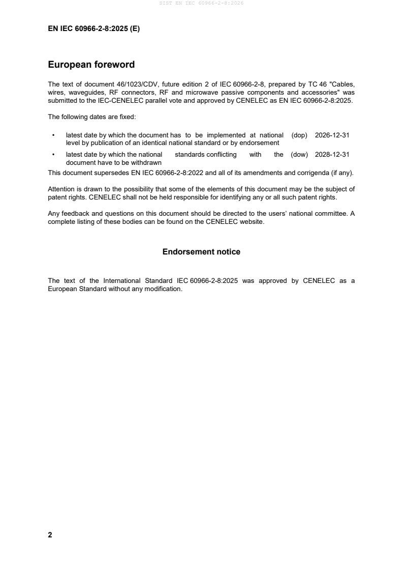 SIST prEN IEC 60966-2-8:2026 is an international standard published by the International Electrotechnical Commission (IEC) under Technical Committee 46. It provides a detailed specification for radio frequency (RF) and coaxial cable assemblies specifically designed for radio and TV receivers. This second edition, published in 2025, updates the 2022 version with significant technical revisions including parameters for straight and right-angled F-Quick connectors, screening requirements, and improved electrical performance metrics.