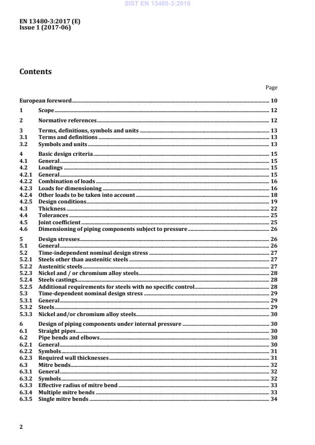 EN13480æ3:2017(E)Issue1(2017æ06)2ContentsFPageFEuropeanforeword.10 1Scope.12 2Normativereferences.12 3Terms,definitions,symbolsandunits.13 3.1Termsanddefinitions.13 3.2Symbolsandunits.13 4Basicdesigncriteria.15 4.1General.15 4.2Loadings.15 4.2.1General.15 4.2.2Combinationofloads.16 4.2.3Loadsfordimensioning.16 4.2.4Otherloadstobetakenintoaccount.18 4.2.5Designconditions.19 4.3Thickness.22 4.4Tolerances.25 4.5Jointcoefficient.25 4.6Dimensioningofpipingcomponentssubjecttopressure.26 5Designstresses.26 5.1General.26 5.2Timeæindependentnominaldesignstress.27 5.2.1Steelsotherthanausteniticsteels.27 5.2.2Austeniticsteels.27 5.2.3Nickeland/orchromiumalloysteels.28 5.2.4Steelscastings.28 5.2.5Additionalrequirementsforsteelswithnospecificcontrol.28 5.3Timeædependentnominaldesignstress.29 5.3.1General.29 5.3.2Steels.29 5.3.3Nickeland/orchromiumalloysteels.30 6Designofpipingcomponentsunderinternalpressure.30 6.1Straightpipes.30 6.2Pipebendsandelbows.30 6.2.1General.30 6.2.2Symbols.31 6.2.3Requiredwallthicknesses.31 6.3Mitrebends.32 6.3.1General.32 6.3.2Symbols.32 6.3.3Effectiveradiusofmitrebend.33 6.3.4Multiplemitrebends.33 6.3.5Singlemitrebends.34 SIST EN 13480-3:2018
