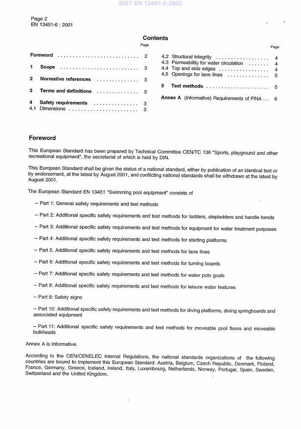 SIST EN 13451-6:2002 is a standard published by the Slovenian Institute for Standardization (SIST). Its full title is "Swimming pool equipment - Part 6: Additional specific safety requirements and test methods for turning boards". This standard covers: This part of EN 136.008 specifies safety requirements for turning boards in addition to the general safety requirements of prEN 136.008-1. The requirements of this specific standard take priority over those in the general standard. This part of EN 136.008 is applicable to manufactured turning boards for use in competition and training.