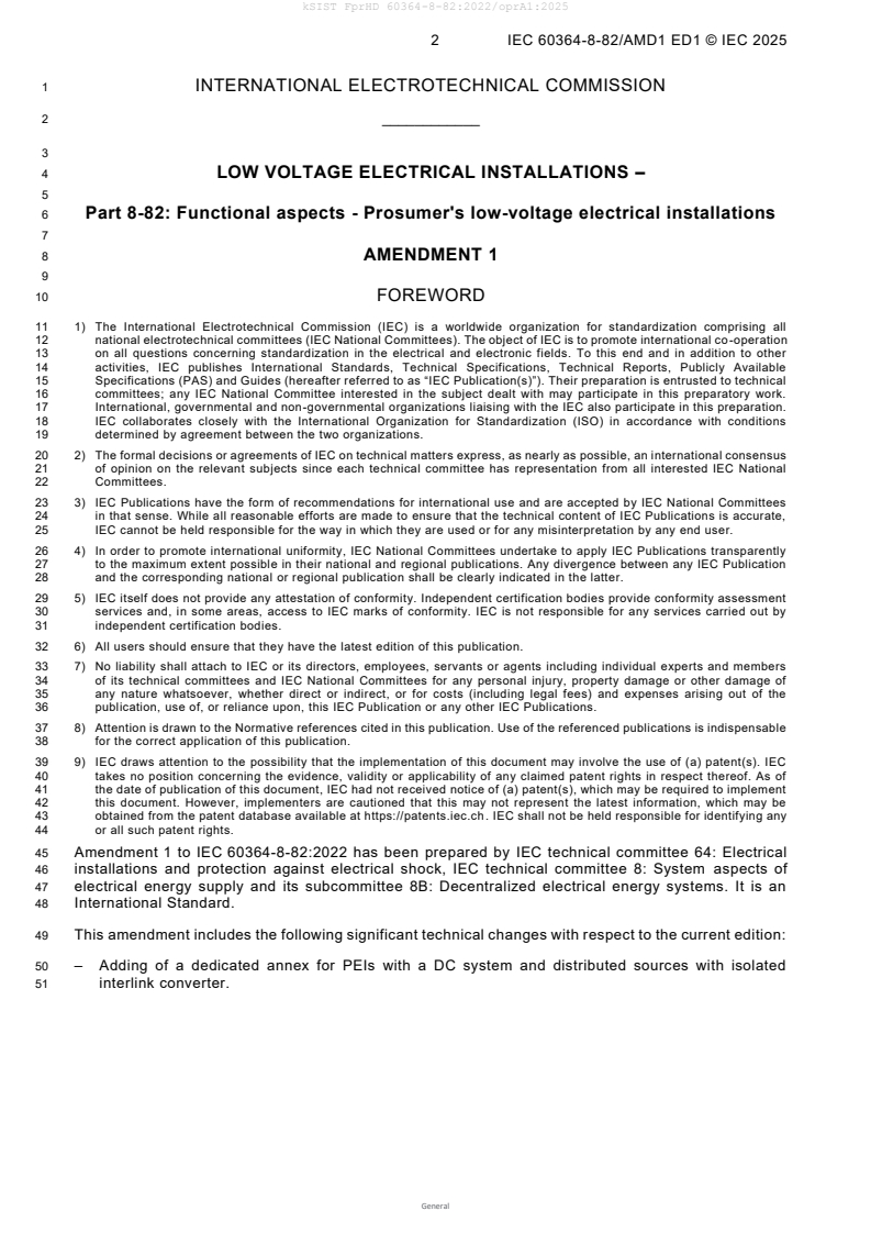 The IEC kSIST FprHD 60364-8-82:2022/oprA1:2025 standard is an amendment to the international standard addressing low-voltage electrical installations with a focus on prosumer's low-voltage electrical installations (PEIs). Developed by the International Electrotechnical Commission (IEC) Technical Committees 64 and 8, this amendment introduces new functional aspects pertinent to decentralized electrical energy systems, particularly those incorporating DC systems and power electronic converters.