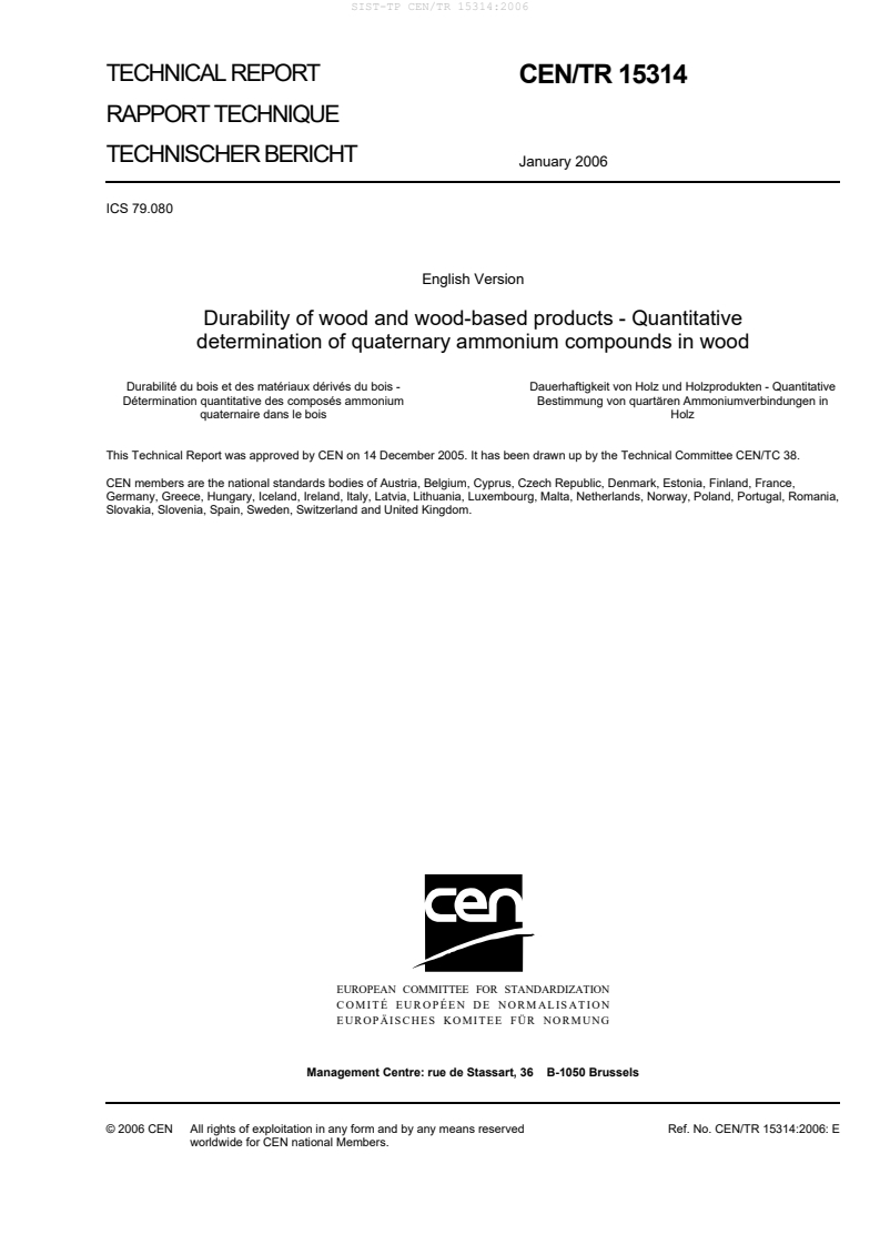 SIST-TP CEN/TR 15314:2006 is a technical report published by the Slovenian Institute for Standardization (SIST). Its full title is "Durability of wood and wood-based products - Quantitative determination of quaternary ammonium compounds in wood". This standard covers: This CEN Technical Report specifies a laboratory method of determining the content of quaternary ammonium compounds in commercially QAC-treated wood. The method described has a measurement range up to QAC contents of 1 500 mg/kg of dry matter. NOTE 1 This method can need some modifications with some wood species such as hardwoods. NOTE 2 It is applicable to QAC with a molar mass ranging between 200 g/mol and 500 g/mol. NOTE 3 The method has a quantification limit corresponding to 250 mg of QAC per kilogram of wood expressed as dry matter.