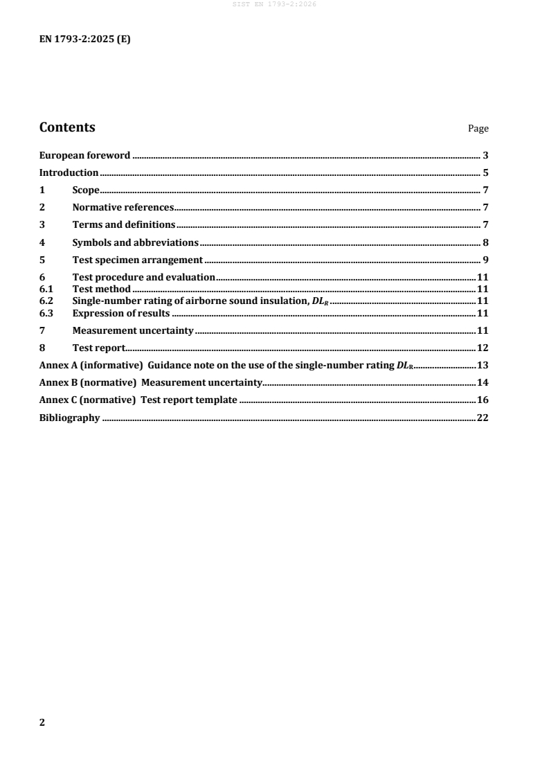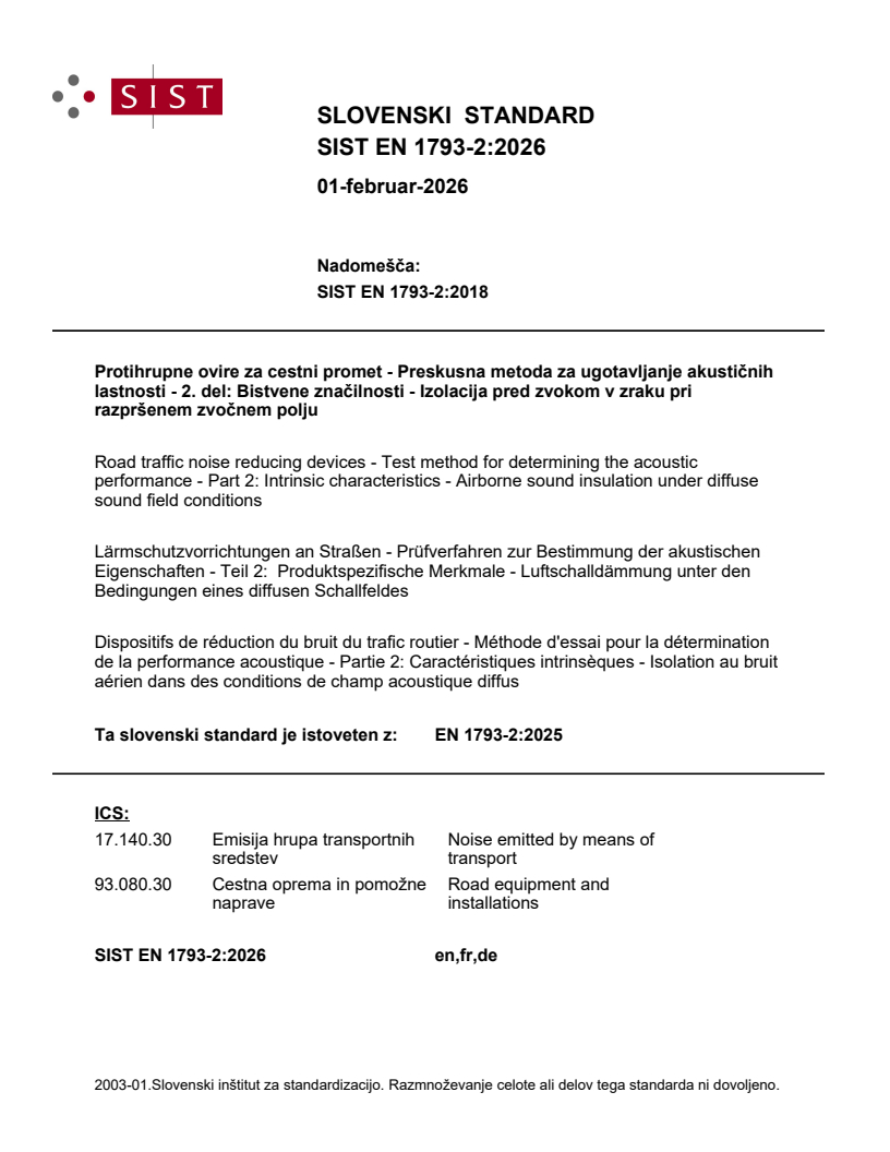 Keywords: kSIST FprEN 1793-2:2025, airborne sound insulation, road traffic noise reducing devices, diffuse sound field, reverberant conditions, noise barriers, acoustic performance testing, CEN standards, measurement uncertainty, acoustic laboratory testing, traffic noise control, noise barrier acoustic rating.