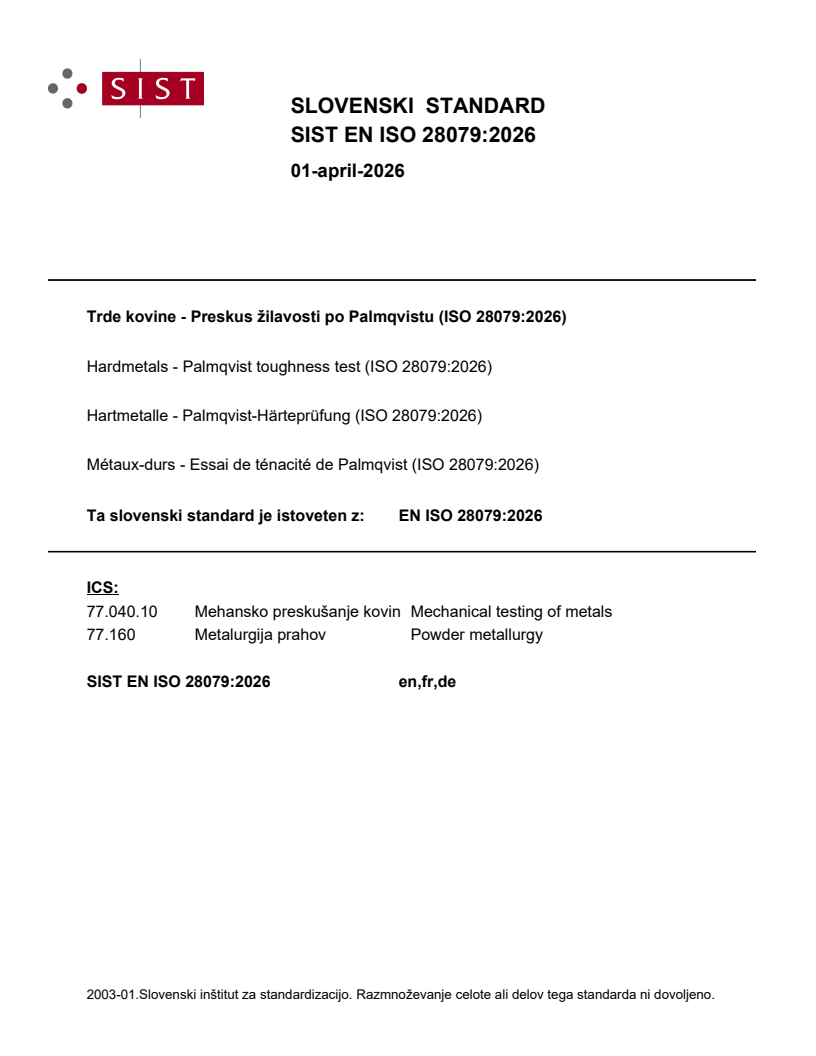 SIST EN ISO 28079:2026 is a standard published by the Slovenian Institute for Standardization (SIST). Its full title is "Hardmetals - Palmqvist toughness test (ISO 28079:2026)". This standard covers: This document specifies a method for measuring the Palmqvist toughness of hardmetals and cermets at room temperature by an indentation method. This document is applicable to a measurement of toughness, called Palmqvist toughness, calculated from the total length of cracks emanating from the corners of a Vickers hardness indentation, and it is intended for use with metal-bonded carbides and carbonitrides (normally called hardmetals, cermets or cemented carbides). The test procedures specified in this document are applicable for use at ambient temperatures, but can be extended to higher or lower temperatures by agreement. The test procedures specified in this document are also applicable for use in a normal laboratory-air environment. This document is not applicable for use in corrosive environments, such as strong acids or seawater.