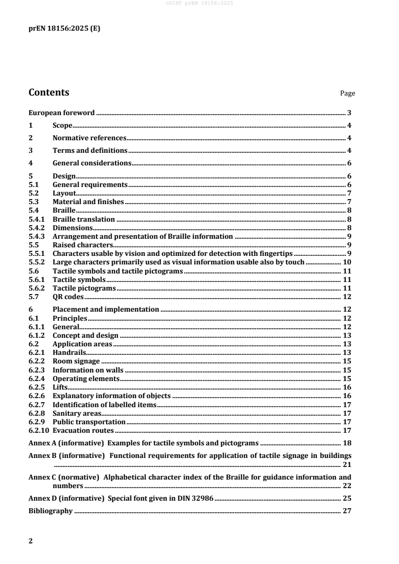 oSIST prEN 18156:2025 is a draft published by the Slovenian Institute for Standardization (SIST). Its full title is "Tactile lettering - Requirements on the presentation and application of Braille and raised characters". This standard covers: This document specifies requirements and technical specifications for information in tactile lettering in the built environment. It sets out rules for content, design, arrangement and application of information elements so that blind and partially sighted people are able to locate, identify, fluently read and interpret this information. This document does not describe technical methods for producing tactile lettering. This document only applies to permanently installed tactile lettering.