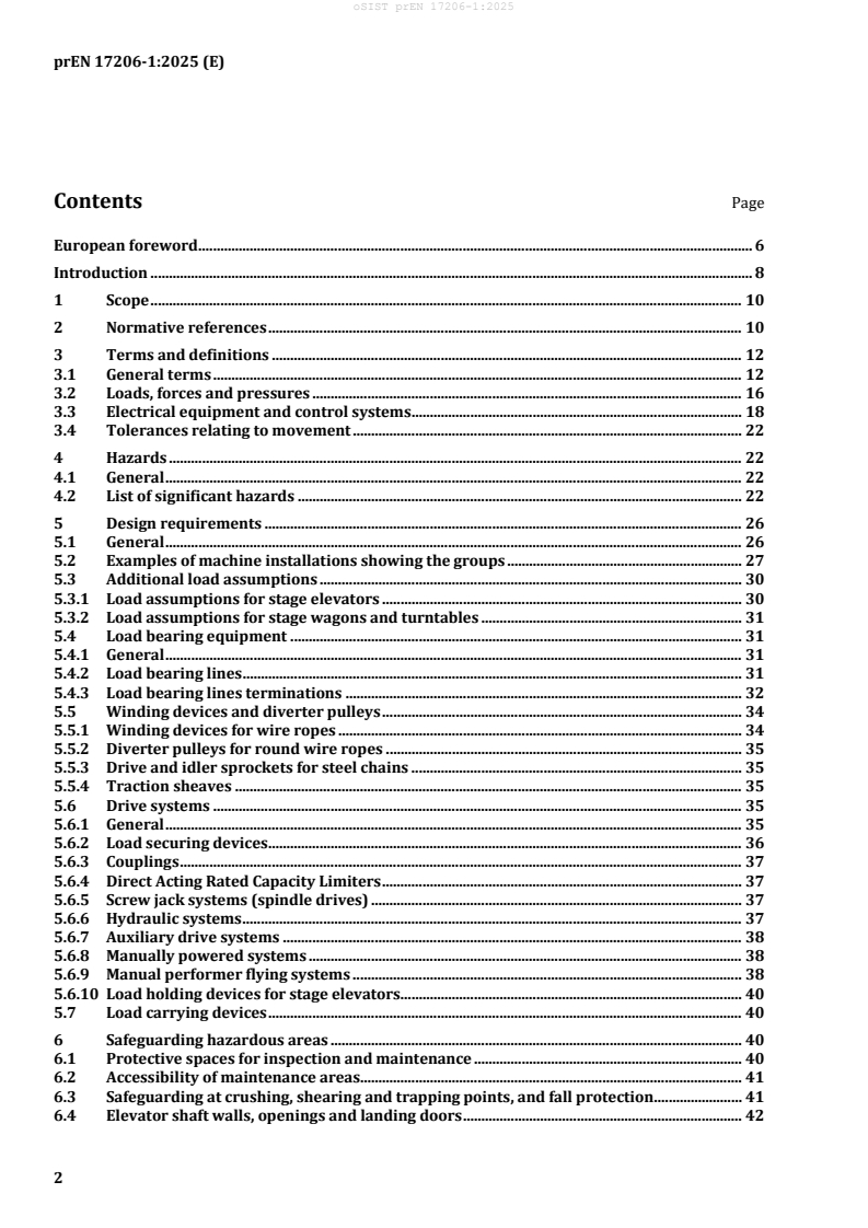 oSIST prEN 17206-1:2025 is a draft published by the Slovenian Institute for Standardization (SIST). Its full title is "Entertainment technology - Part 1: Machinery for stages and other production areas - Safety requirements and inspections". This standard covers: This document applies to machinery, machinery installations and machinery control systems used in places of assembly and in staging and production facilities for events and theatrical productions (stage machinery, for short). Such facilities include theatres, multi-purpose halls, exhibition halls; film, television and radio studios; concert halls, schools, bars, discotheques, open-air stages and other rooms for shows and events. The document applies to machinery installations with guided or unguided loads. This document covers machinery used in the entertainment industry including machinery that is excluded from the Machinery Directive (2006/42/EC) specifically Article 1, 2(j) which excludes “machinery intended to move performers during artistic performances”. This machinery includes controls, electrical and electronic control systems, electrical and electronic equipment, hydraulic and pneumatic power supplies. The principles in this document also apply to machinery installations based on new technologies or specially designed installations which are not expressly mentioned here but which nevertheless operate in a similar manner or are meant for similar purposes to the equipment listed above.