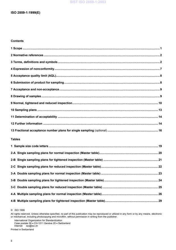 SIST ISO 2859-1:2003 is a standard published by the Slovenian Institute for Standardization (SIST). Its full title is "Sampling procedures for inspection by attributes -- Part 1: Sampling schemes indexed by acceptance quality limit (AQL) for lot-by-lot inspection". This standard covers: 1.1 This part of ISO 2859 specifies an acceptance sampling system for inspection by attributes. It is indexed in terms of the acceptance quality limit (AQL). Its purpose is to induce a supplier through the economic and psychological pressure of lot non-acceptance to maintain a process average at least as good as the specified acceptance quality limit, while at the same time providing an upper limit for the risk to the consumer of accepting the occasional poor lot. Sampling schemes designated in this part of ISO 2859 are applicable, but not limited, to inspection of ¾ end items, ¾ components and raw materials, ¾ operations, ¾ materials in process, ¾ supplies in storage, ¾ maintenance operations, ¾ data or records, and ¾ administrative procedures. 1.2 These schemes are intended primarily to be used for a continuing series of lots, that is, a series long enough to allow the switching rules (9.3) to be applied. These rules provide: a) a protection to the consumer (by means of a switch to tightened inspection or discontinuation of sampling inspection) should a deterioration in quality be detected; b) an incentive (at the discretion of the responsible authority) to reduce inspection costs (by means of a switch to reduced inspection) should consistently good quality be achieved. Sampling plans in this part of ISO 2859 may also be used for the inspection of lots in isolation but, in this case the user is strongly advised to consult the operating characteristic curves to find a plan that will yield the desired protection (see 12.6). In that case, the user is also referred to the sampling plans indexed by limiting quality (LQ) given in ISO 2859-2.