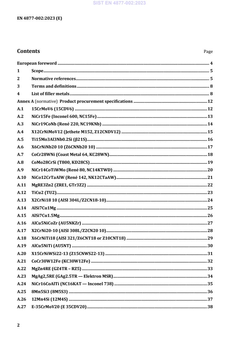 - Procurement specifications: Annex A (normative) provides product procurement specifications for specific designations (examples include 15CrMoV6, Inconel and René alloys, Ti β‑alloys, various aluminium and magnesium filler alloys).