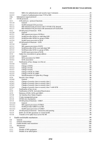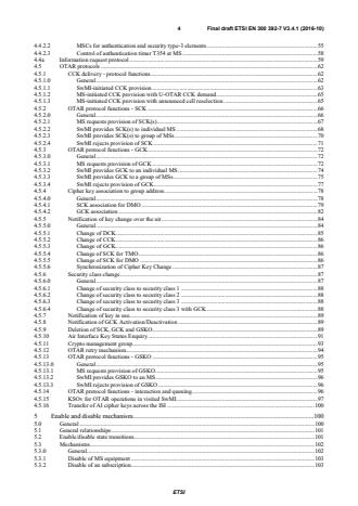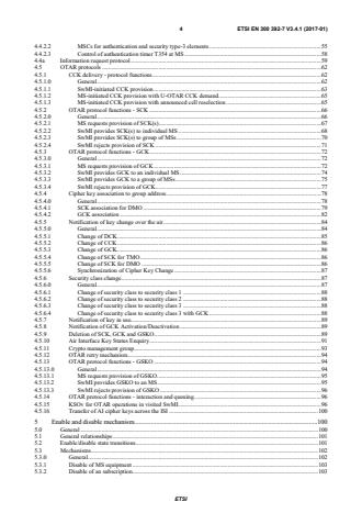 ETSI ETSI EN 300 392-7 V3.4.1 (2017-01) 5 5.3.3 Disable of subscription and equipment . 103 5.3.4 Enable an MS equipment . 103 5.3.5 Enable an MS subscription . 103 5.3.6 Enable an MS equipment and subscription . 103 5.4 Enable/disable protocol . 104 5.4.1 General case . 104 5.4.2 Status of cipher key material. 105 5.4.2.1 Permanently disabled state . 105 5.4.2.2 Temporarily disabled state . 105 5.4.3 Specific protocol exchanges . 106 5.4.3.0 General . 106 5.4.3.1 Disabling an MS with mutual authentication . 106 5.4.3.2 Enabling an MS with mutual authentication . 107 5.4.3.3 Enabling an MS with non-mutual authentication . 108 5.4.3.4 Disabling an MS with non-mutual authentication . 110 5.4.4 Enabling an MS without authentication . 111 5.4.5 Disabling an MS without authentication . 111 5.4.6 Rejection of enable or disable command . 111 5.4.6a Expiry of Enable/Disable protocol timer . 112 5.4.7 MM service primitives . 112 5.4.7.0 General . 112 5.4.7.1 TNMM-DISABLING primitive . 113 5.4.7.2 TNMM-ENABLING primitive . 113 6 Air Interface (AI) encryption . 113 6.1 General principles. 113 6.2 Security class . 114 6.2.a General . 114 6.2.0 Notification of security class . 115 6.2.0.0 General . 115 6.2.0.1 Security Class of Neighbouring Cells . 116 6.2.0.2 Identification of MS security capabilities . 116 6.2.1 Constraints on LA arising from cell class . 116 6.3 Key Stream Generator (KSG) . 116 6.3.0 General . 116 6.3.1 KSG numbering and selection . 117 6.3.2 Interface parameters . 117 6.3.2.1 Initial Value (IV) . 117 6.3.2.2 Cipher Key . 118 6.4 Encryption mechanism . 118 6.4.0 General . 118 6.4.1 Allocation of KSS to logical channels . 118 6.4.2 Allocation of KSS to logical channels with PDU association . 120 6.4.2.1 General . 120 6.4.2.2 KSS allocation on phase modulation channels . 121 6.4.2.3 KSS allocation on QAM channels . 122 6.4.2.3.0 General . 122 6.4.2.3.1 Fixed mapping . 122 6.4.2.3.2 Offset mapping . 123 6.4.3 Synchronization of data calls where data is multi-slot interleaved . 124 6.4.4 Recovery of stolen frames from interleaved data . 125 6.5 Use of cipher keys . 126 6.5.0 General . 126 6.5.1 Identification of encryption state of downlink MAC PDUs . 127 6.5.1.0 General . 127 6.5.1.1 Class 1 cells . 127 6.5.1.2 Class 2 cells . 128 6.5.1.3 Class 3 cells . 128 6.5.2 Identification of encryption state of uplink MAC PDUs . 128 6.6 Mobility procedures . 129 6.6.1 General requirements . 129 6.6.1.0 Common requirements . 129 SIST EN 300 392-7 V3.4.1:2017