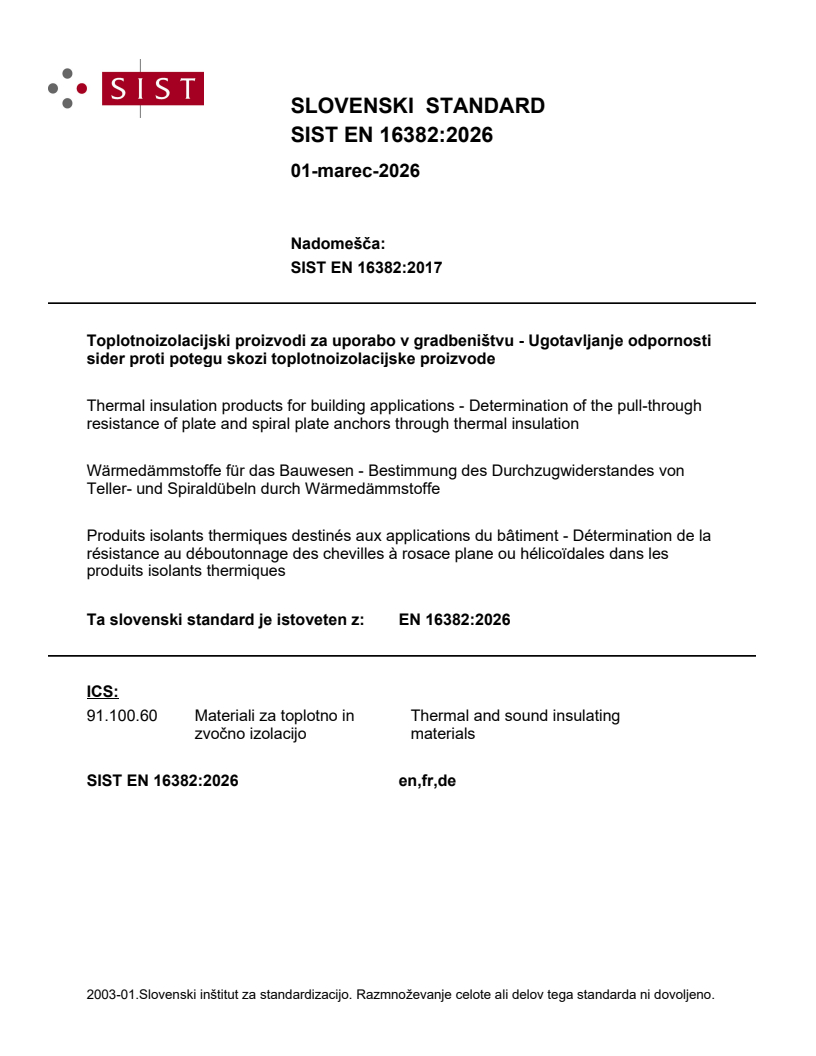 SIST EN 16382:2026 is a standard published by the Slovenian Institute for Standardization (SIST). Its full title is "Thermal insulation products for building applications - Determination of the pull-through resistance of plate and spiral plate anchors through thermal insulation". This standard covers: This document specifies equipment and procedures for determining the pull-through resistance of plate and spiral anchors through thermal insulation.