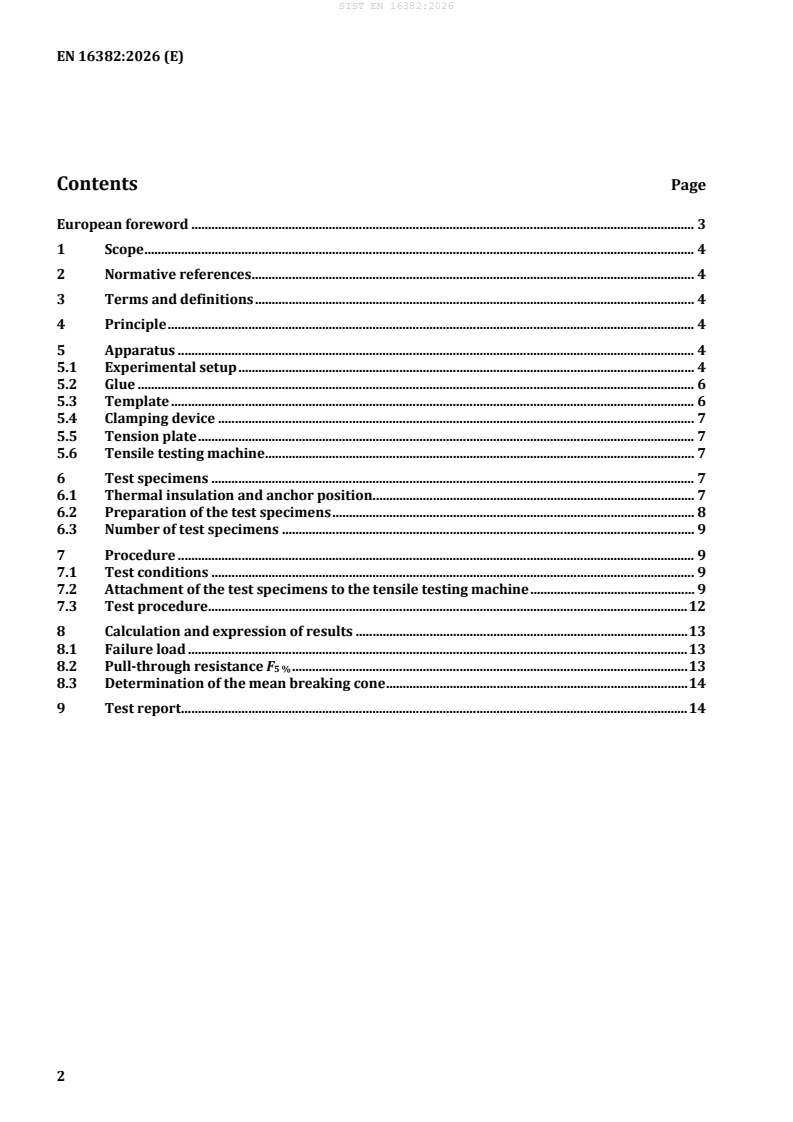 EN 16382:2026 - issued by CEN - defines a laboratory test method for measuring the pull-through resistance of plate and spiral anchors through thermal insulation products used in building applications. The standard specifies the required equipment, specimen preparation, test conditions and the procedure to apply a direct tensile load perpendicular to the insulation surface until failure. It is intended for product evaluation, quality control and performance comparison of fixation systems used in external insulation and cladding systems.