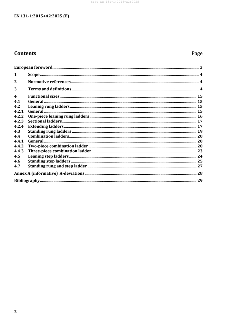 SIST EN 131-1:2016+A2:2025 is a standard published by the Slovenian Institute for Standardization (SIST). Its full title is "Ladders - Part 1: Terms, types, functional sizes". This standard covers: This European Standard defines terms and specifies the general design characteristics of ladders. It applies to portable ladders designed for general professional and non-professional use. This standard does not apply to portable ladders which by their design and instructions are intended and limited only for a specific professional use and as a result are not for general professional or non-professional use." NOTE 1 For multiple hinge joint ladders EN 131–4 applies. NOTE 2 For telescopic ladders EN 131–6 applies. NOTE 3 For mobile ladders with platforms EN 131–7 applies. NOTE 4 This standard does not apply to step stools for which EN 14183 applies. NOTE 5 For ladders to work near high voltage installations, EN 61478 applies and for working near low voltage electric installations, EN 50528 applies.