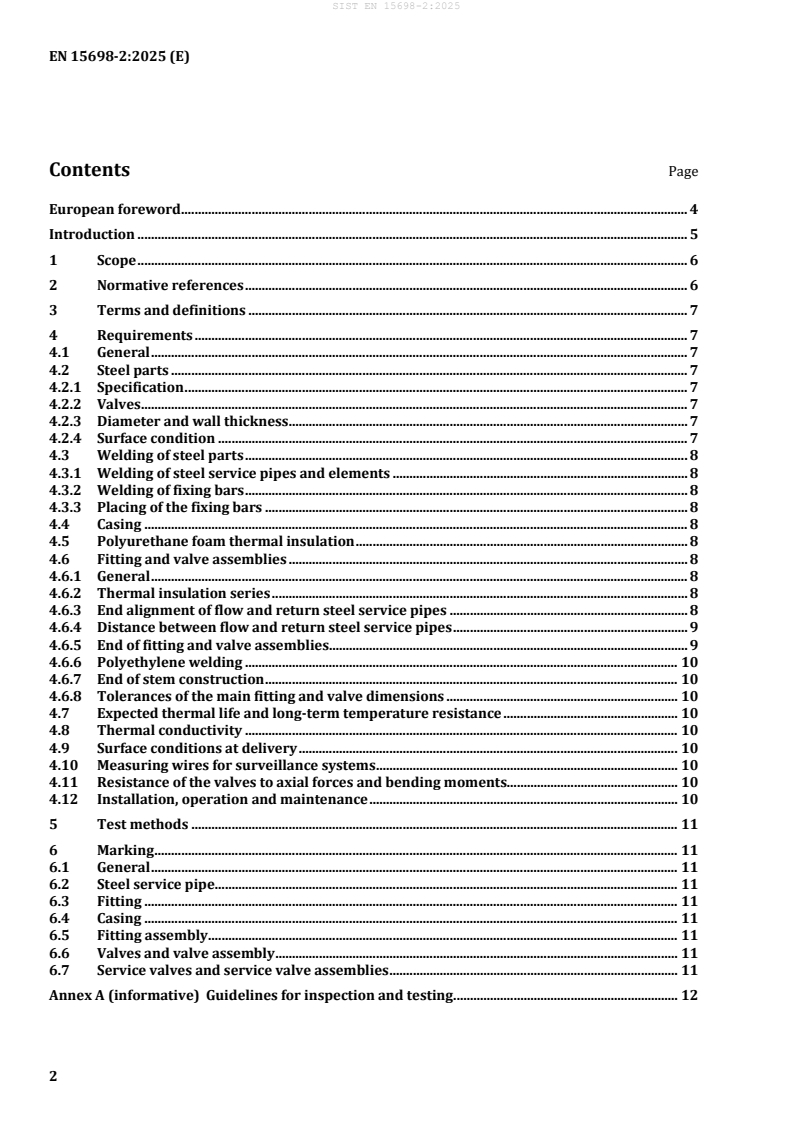 EN 15698-2:2025 is a CEN European standard for district heating pipes covering factory-made bonded twin pipe systems for directly buried hot water networks. It specifies requirements and test methods for fitting and steel valve assemblies composed of two steel service pipes, polyurethane (PUR) thermal insulation and a single polyethylene casing. The standard governs prefabricated bends, T-pieces, reducers and main-line valves intended for long-term buried operation and aligns with system design requirements in EN 13941-1.