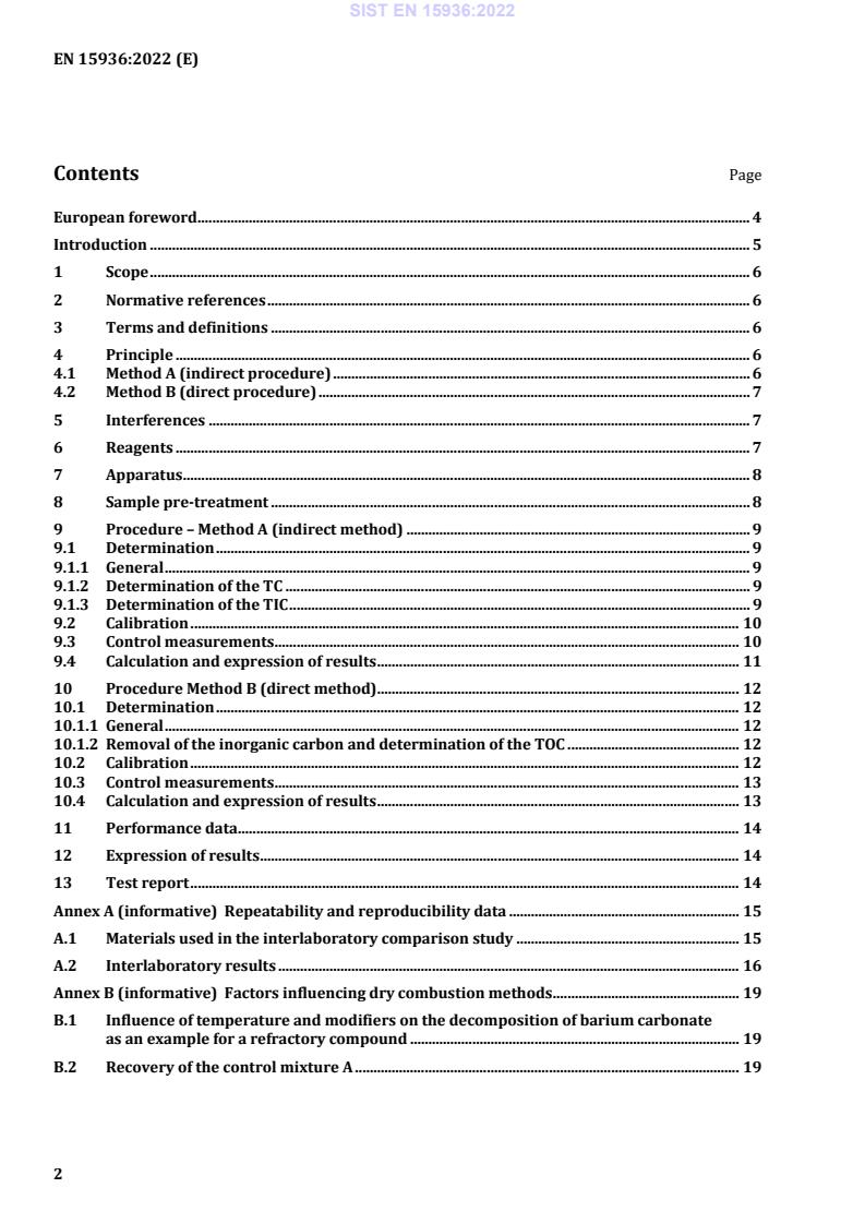Ta evropski standard določa dve metodi za določitev skupnega organskega ogljika (TOC) v blatu, predelanih bioloških odpadkih, prsti, odpadkih in vzorcih usedlin, ki vsebujejo več kot 1 g ogljika na kg suhe snovi (0,1 %).