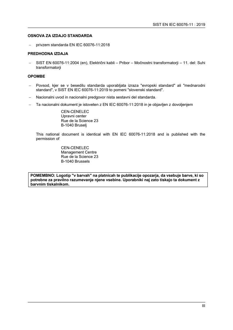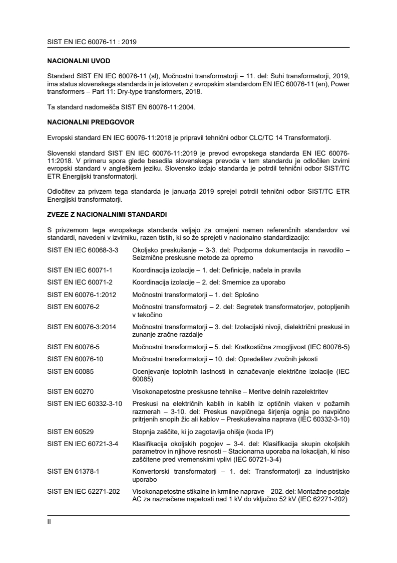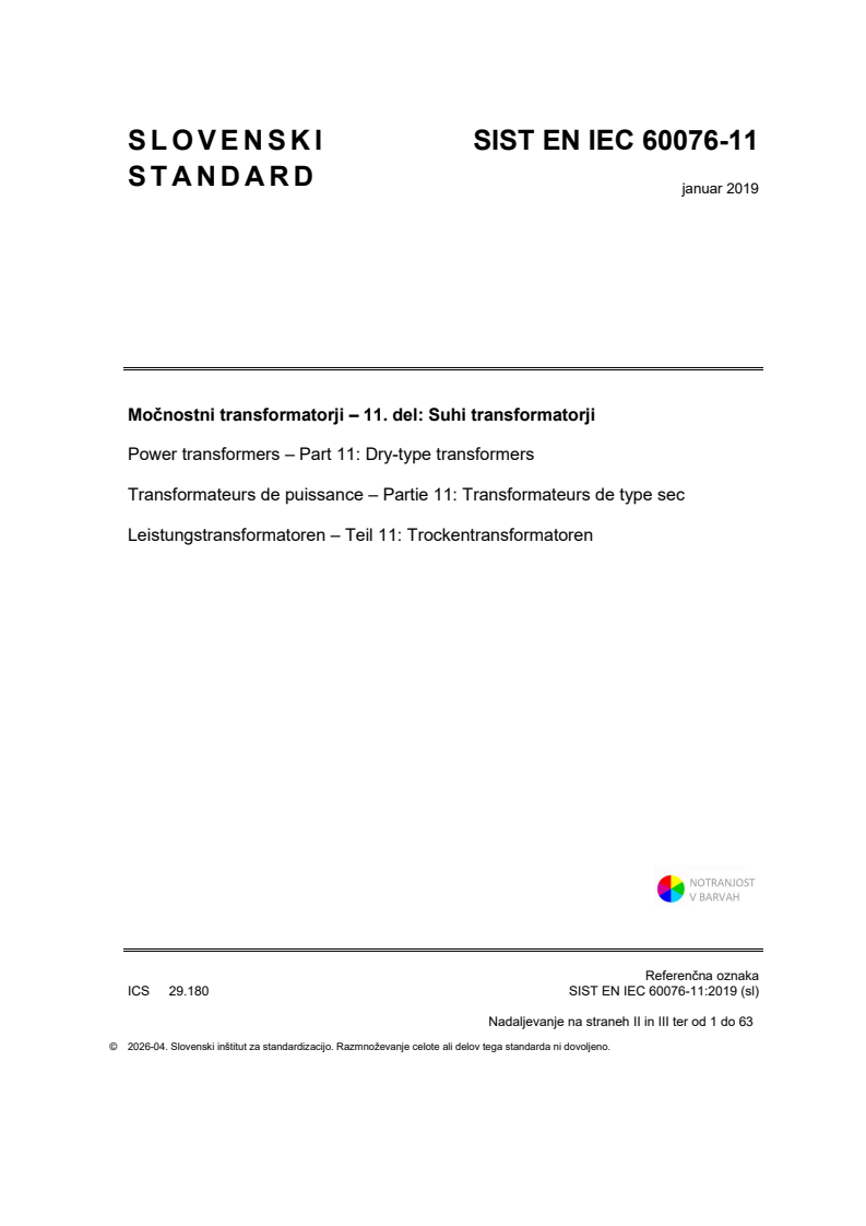 EN IEC 60076-11:2018 (CLC adoption of IEC 60076-11:2018) is the international European standard for dry-type power transformers (including autotransformers) with highest voltage for equipment up to and including 72.5 kV, where at least one winding operates above 1.1 kV. This second edition replaces the 2004 edition and is published as an RLV (Redline Version) that shows technical changes versus the previous edition. The standard defines service conditions, ratings, performance, testing and safety requirements specific to dry-type transformers.
