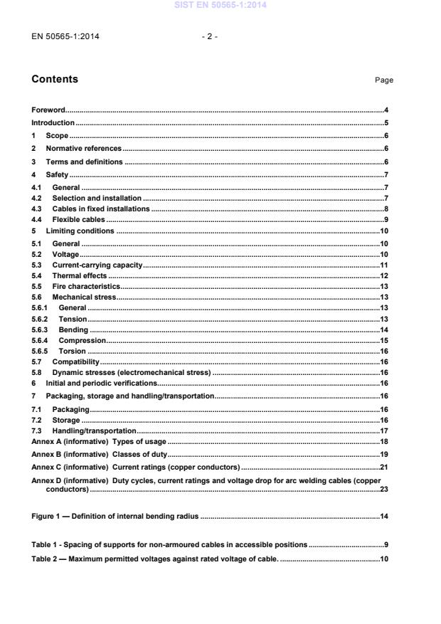 - Annexes and tables: Informative annexes cover types of usage, classes of duty, current ratings (Annex C) and duty cycles for arc welding cables (Annex D). The main body includes tables for support spacing, permitted voltages and recommended bending radii.