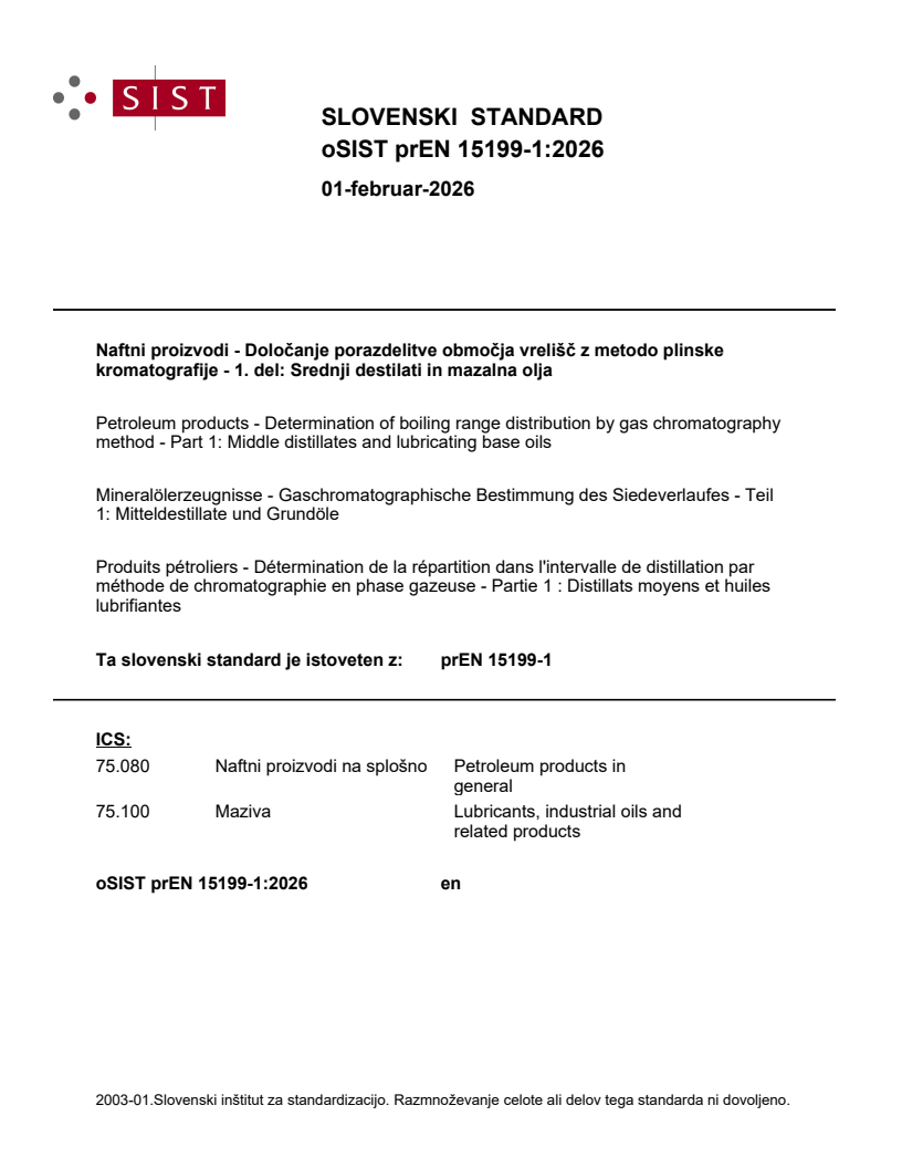 Keywords: oSIST prEN 15199-1:2026, boiling range distribution, petroleum products, middle distillates, lubricating base oils, gas chromatography, flame ionization detection, GC-FID, petroleum standards, petroleum testing, distillate characterization, CEN standards, ASTM D6352, petrochemical analysis, quality control, petroleum product analysis.