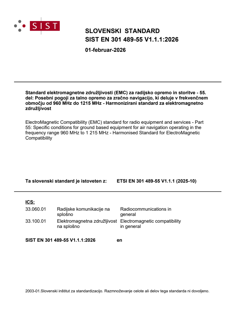 SIST EN 301 489-55 V1.1.1:2026 is a standard published by the Slovenian Institute for Standardization (SIST). Its full title is "ElectroMagnetic Compatibility (EMC) standard for radio equipment and services - Part 55: Specific conditions for ground based equipment for air navigation operating in the frequency range 960 MHz to 1 215 MHz - Harmonised Standard for ElectroMagnetic Compatibility". This standard covers: The present document specifies technical characteristics and methods of measurement in respect of ElectroMagnetic Compatibility (EMC) for the following equipment: • Secondary Surveillance Radar (SSR) interrogator; • SSR Far Field Monitor (FFM); • Multilateration (MLAT); • Wide Area Multilateration (WAM); • Distance Measurement Equipment (DME) land station transponder; • Extended Squitter (ES) / Non Transponder (NT). operating in the frequency range 960 MHz to 1 215 MHz. The above mentioned radio equipment can be intended for use at a fixed location or mobile use. The standard covers equipment consisting of one or more enclosures that contain at least one of the following functionalities: transmitter, receiver, signal processing. Other parts which are not part of the navigation functionality e.g. local UPS, air conditioning equipment, dehumidifying equipment, communication network equipment, etc., are not in the scope of the present document, unless these parts are implemented inside the system enclosure(s). NOTE 1: The relationship between the present document and essential requirements of article 3.1(b) of Directive 2014/53/EU [i.1] is given in annex A. Technical specifications related to conducted emission EMC requirements below 9 kHz on the AC mains port of radio equipment are not included in the present document. NOTE 2: Such technical specifications are normally found in the relevant product family standards for AC mains powered equipment (e.g. EN 61000-3-2 [i.3] and EN 61000-3-3 [i.4]).