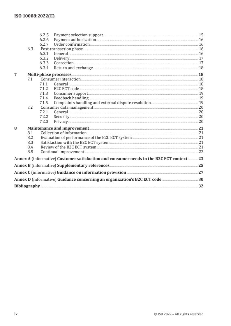 This document gives guidance on planning, designing, developing, implementing, maintaining and improving an effective and efficient business-to-consumer electronic commerce transaction (B2C ECT) system within an organization. It is applicable to any organization engaged in, or planning to be engaged in, a B2C ECT, regardless of size, type and activity. The focus of this document is on organizations that directly offer and provide products and services to consumers. This document aims to enable organizations to set up a fair, effective, efficient, transparent and secure B2C ECT system, in order to enhance consumers’ confidence in B2C ECTs and increase the satisfaction of consumers. It is aimed at B2C ECTs concerning consumers as a sub-set of customers. The guidance given in this document can complement an organization’s quality management system.
