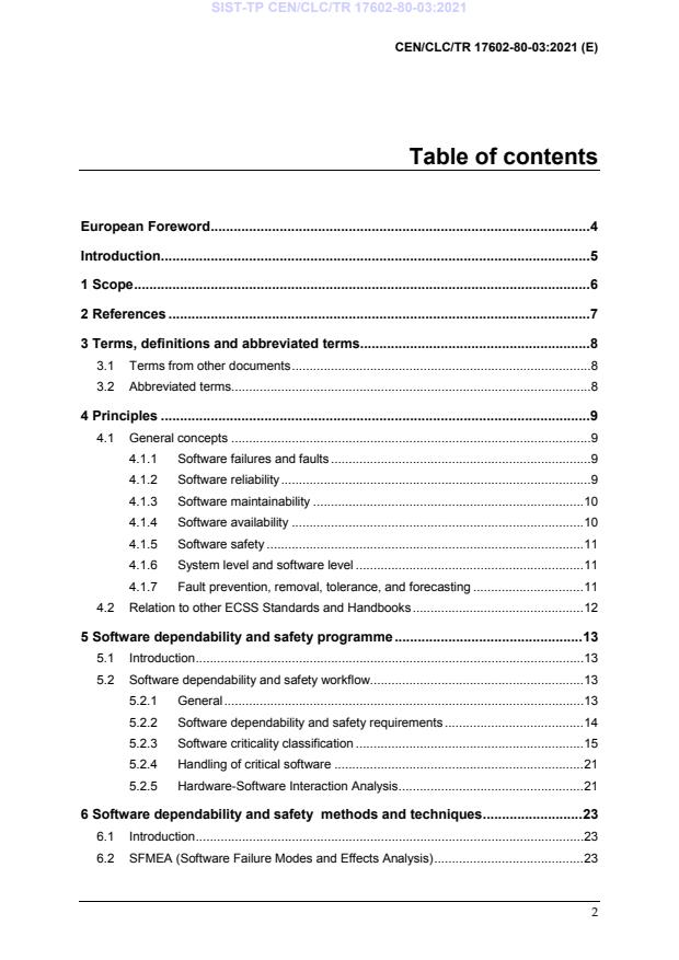 This Handbook provides guidance on the application of the dependability and safety requirements relevant to software defined in EN 16602-80 (equivalent of ECSS-Q-ST-80). This Handbook provides support for the selection and application of software dependability and safety methods and techniques that can be used in the development of software-intensive space systems. This Handbook covers all of the different kinds of software for which EN 16602-80 (equivalent of ECSS-Q-ST-80) is applicable. Although the overall software dependability and safety workflow description is mainly targeted to the development of spacecraft, the described approach can be adapted to projects of different nature (e.g. launchers, ground systems). The methods and techniques described in the scope of this Handbook are limited to assessment aspects, not including development and implementation techniques for dependability and safety (e.g. fault tolerance techniques, or development methods like coding standards, etc.). Although dependability is a composite term, including reliability, availability and maintainability, this Handbook addresses in particular the reliability aspects. Software maintainability and availability are not covered in depth by this handbook, because the relevant methods and techniques are still undergoing improvement. Nevertheless, whenever a link can be made to either of these two characteristics, it is explicitly mentioned in the corresponding section.