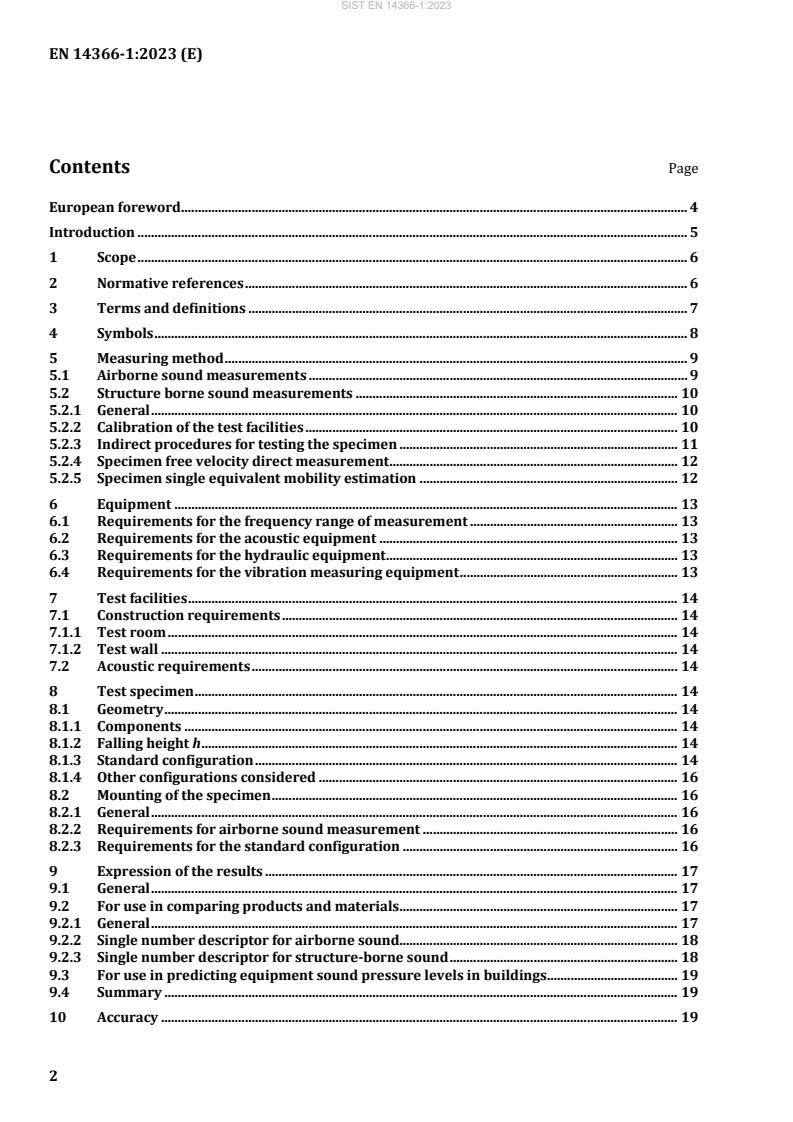 – določa laboratorijske merilne metode za določanje vhodnih podatkov, ki so potrebni tako za primerjavo izdelkov in materialov kot za napovedovanje ravni zvoka v stavbah ob uporabi standarda EN 12354-5. Te vhodne veličine so raven zvočne moči cevnega sistema za zvok, ki se prenaša po zraku, in tri veličine za zvok, ki se prenaša po konstrukciji (prosta hitrost cevnega sistema, blokirana sila in mobilnost), na podlagi katerih se določi nameščena moč cevnega sistema, vhodni vir za standard EN 12354-5;