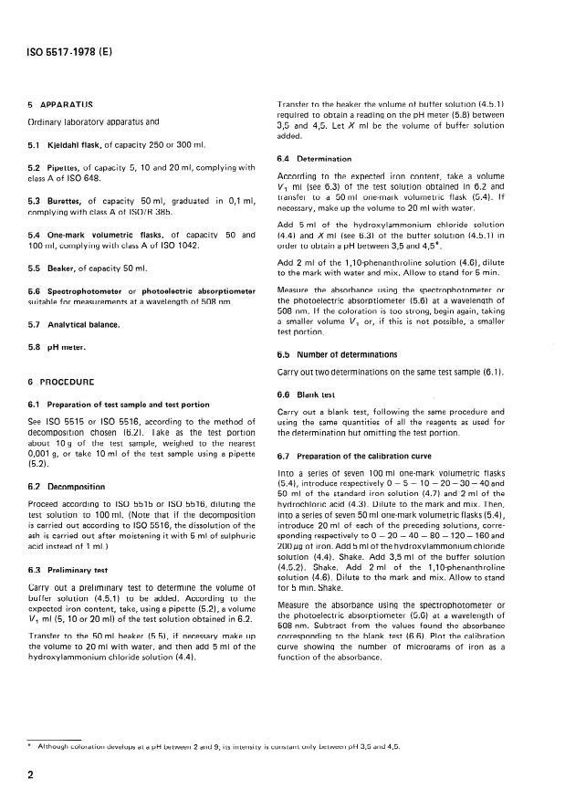 ISO 5517:1978 specifies a photometric procedure for the determination of iron content in fruits, vegetables and derived products using the 1,10‑phenanthroline complex. The method is based on decomposition of organic matter, chemical reduction of ferric iron to ferrous form, formation of a stable red-coloured iron(II)/1,10‑phenanthroline complex in a buffered medium, and photometric measurement at 508 nm.