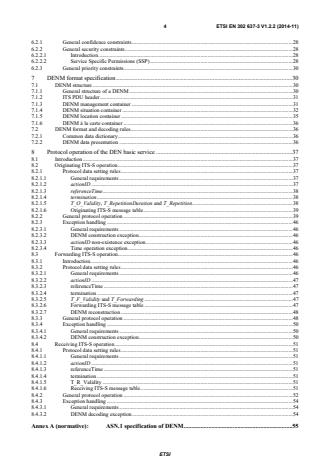 ETSI ETSI EN 302 637-3 V1.2.2 (2014-11) 4 6.2.1 General confidence constraints . 28 6.2.2 General security constraints . 28 6.2.2.1 Introduction . 28 6.2.2.2 Service Specific Permissions (SSP) . 28 6.2.3 General priority constraints. 30 7 DENM format specification . 30 7.1 DENM structure . 30 7.1.1 General structure of a DENM . 30 7.1.2 ITS PDU header . 31 7.1.3 DENM management container . 31 7.1.4 DENM situation container . 32 7.1.5 DENM location container . 35 7.1.6 DENM à la carte container . 36 7.2 DENM format and decoding rules. 36 7.2.1 Common data dictionary . 36 7.2.2 DENM data presentation . 36 8 Protocol operation of the DEN basic service . 37 8.1 Introduction . 37 8.2 Originating ITS-S operation . 37 8.2.1 Protocol data setting rules . 37 8.2.1.1 General requirements . 37 8.2.1.2 actionID . 37 8.2.1.3 referenceTime . 38 8.2.1.4 termination . 38 8.2.1.5 T_O_Validity, T_RepetitionDuration and T_Repetition . 38 8.2.1.6 Originating ITS-S message table . 39 8.2.2 General protocol operation . 39 8.2.3 Exception handling . 46 8.2.3.1 General requirements . 46 8.2.3.2 DENM construction exception . 46 8.2.3.3 actionID non-existence exception . 46 8.2.3.4 Time operation exception . 46 8.3 Forwarding ITS-S operation . 46 8.3.1 Introduction. 46 8.3.2 Protocol data setting rules . 46 8.3.2.1 General requirements . 46 8.3.2.2 actionID . 47 8.3.2.3 referenceTime . 47 8.3.2.4 termination . 47 8.3.2.5 T_F_Validity and T_Forwarding . 47 8.3.2.6 Forwarding ITS-S message table . 47 8.3.2.7 DENM reconstruction . 48 8.3.3 General protocol operation . 48 8.3.4 Exception handling . 50 8.3.4.1 General requirements . 50 8.3.4.2 DENM construction exception . 50 8.4 Receiving ITS-S operation . 51 8.4.1 Protocol data setting rules . 51 8.4.1.1 General requirements . 51 8.4.1.2 actionID . 51 8.4.1.3 referenceTime . 51 8.4.1.4 termination . 51 8.4.1.5 T_R_Validity . 51 8.4.1.6 Receiving ITS-S message table . 51 8.4.2 General protocol operation . 52 8.4.3 Exception handling . 54 8.4.3.1 General requirements . 54 8.4.3.2 DENM decoding exception . 54 Annex A (normative): ASN.1 specification of DENM . 55 SIST EN 302 637-3 V1.2.2:2015