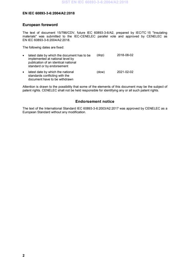 This amendment A2 modifies the European Standard EN 60893-3-6:2004; it was approved by CENELEC on 2017-10-20. CENELEC