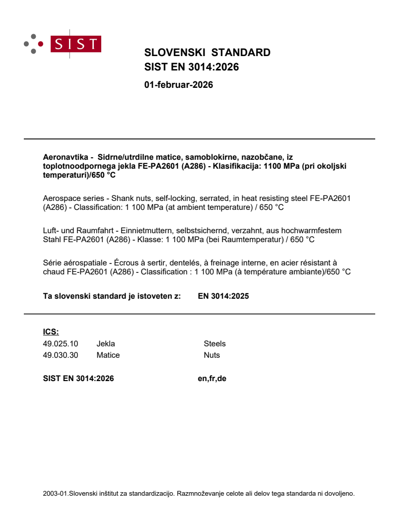 SIST EN 3014:2026 is a standard published by the Slovenian Institute for Standardization (SIST). Its full title is "Aerospace series - Shank nuts, self-locking, serrated, in heat resisting steel FE-PA2601 (A286) - Classification: 1 100 MPa (at ambient temperature) / 650 °C". This standard covers: This document specifies the characteristics of self-locking serrated shank nuts in FE-PA2601, for aerospace applications. Classification: 1 100 MPa /650 °C .