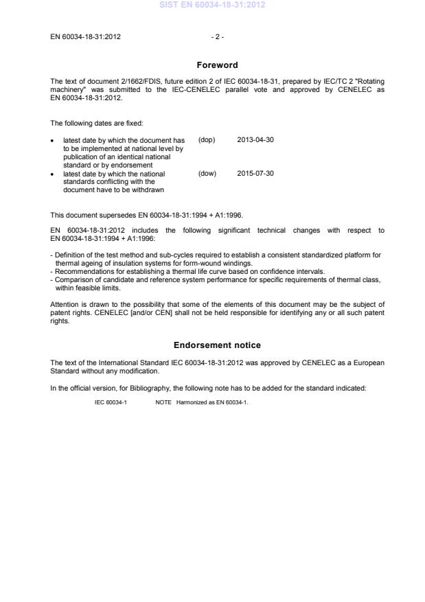 8) Attention is drawn to the Normative references cited in this publication. Use of the referenced publications is indispensable for the correct application of this publication. 9) Attention is drawn to the possibility that some of the elements of this IEC Publication may be the subject of patent rights. IEC shall not be held responsible for identifying any or all such patent rights. International Standard IEC 60034-18-31 has been prepared by IEC technical committee 2: Rotating machinery. This second edition cancels and replaces the first edition published in 1992, and its amendment 1 (1996), of which it constitutes a technical revision. The main technical changes with regard to the previous edition include: – Definition of the test method and sub-cycles required to establish a consistent standardized platform for thermal ageing of insulation systems for form-wound windings. – Recommendations for establishing a thermal life curve based on confidence intervals. – Comparison of candidate and reference system performance for specific requirements of thermal class, within feasible limits. SIST EN 60034-18-31:2012