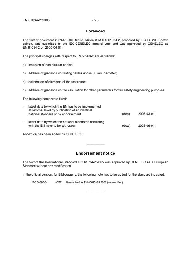 EN 61034-2:2005 - Measurement of smoke density of cables burning under defined conditions - Part 2: Test procedure and requirements (CLC/CENELEC) specifies the standardized test procedure for measuring smoke density emitted by cables during combustion. It complements Part 1 (IEC 61034-1) which defines the test apparatus (including a 27 m³ test enclosure, photometric system and standard fire source). EN 61034-2 sets out sample preparation, assembly and burning methods, evaluation criteria and the required content of test reports. This edition extended scope to cables down to 1 mm, non‑circular cables and includes guidance for very large cables (>80 mm) and fire‑safety engineering calculations.