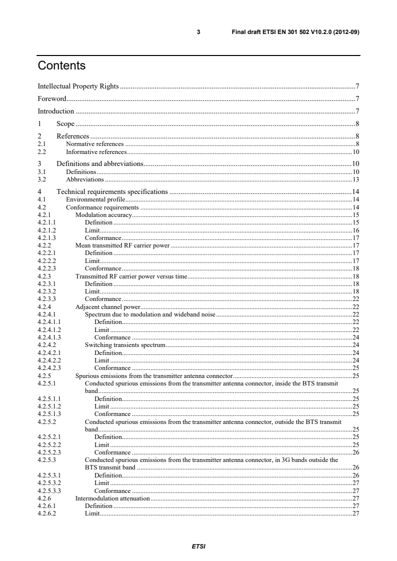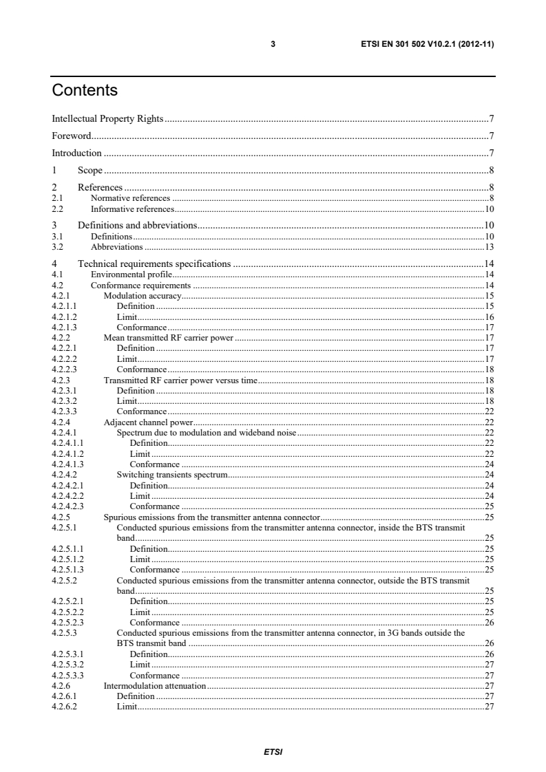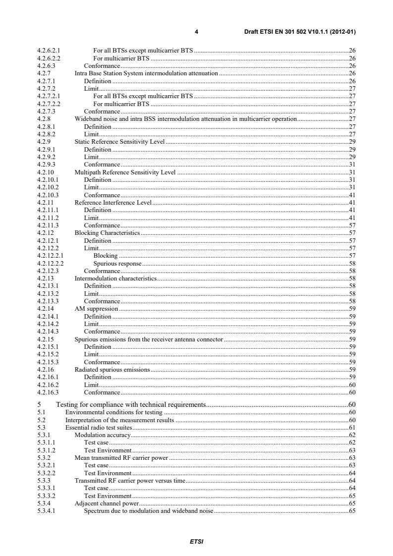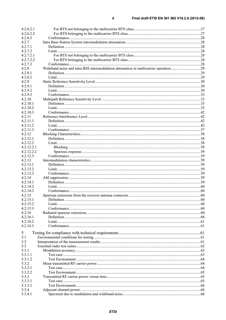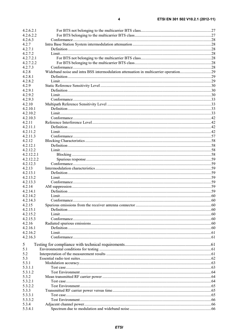 ETSI ETSI EN 301 502 V10.2.1 (2012-11) 4 4.2.6.2.1 For BTS not belonging to the multicarrier BTS class. 27 4.2.6.2.2 For BTS belonging to the multicarrier BTS class . 27 4.2.6.3 Conformance . 28 4.2.7 Intra Base Station System intermodulation attenuation . 28 4.2.7.1 Definition . 28 4.2.7.2 Limit . 28 4.2.7.2.1 For BTS not belonging to the multicarrier BTS class. 28 4.2.7.2.2 For BTS belonging to the multicarrier BTS class . 28 4.2.7.3 Conformance . 28 4.2.8 Wideband noise and intra BSS intermodulation attenuation in multicarrier operation . 29 4.2.8.1 Definition . 29 4.2.8.2 Limit . 29 4.2.9 Static Reference Sensitivity Level . 30 4.2.9.1 Definition . 30 4.2.9.2 Limit . 30 4.2.9.3 Conformance . 33 4.2.10 Multipath Reference Sensitivity Level . 33 4.2.10.1 Definition . 33 4.2.10.2 Limit . 33 4.2.10.3 Conformance . 42 4.2.11 Reference Interference Level . 42 4.2.11.1 Definition . 42 4.2.11.2 Limit . 42 4.2.11.3 Conformance . 57 4.2.12 Blocking Characteristics . 58 4.2.12.1 Definition . 58 4.2.12.2 Limit . 58 4.2.12.2.1 Blocking . 58 4.2.12.2.2 Spurious response . 59 4.2.12.3 Conformance . 59 4.2.13 Intermodulation characteristics . 59 4.2.13.1 Definition . 59 4.2.13.2 Limit . 59 4.2.13.3 Conformance . 59 4.2.14 AM suppression . 59 4.2.14.1 Definition . 59 4.2.14.2 Limit . 60 4.2.14.3 Conformance . 60 4.2.15 Spurious emissions from the receiver antenna connector . 60 4.2.15.1 Definition . 60 4.2.15.2 Limit . 60 4.2.15.3 Conformance . 60 4.2.16 Radiated spurious emissions . 60 4.2.16.1 Definition . 60 4.2.16.2 Limit . 61 4.2.16.3 Conformance . 61 5 Testing for compliance with technical requirements . 61 5.1 Environmental conditions for testing . 61 5.2 Interpretation of the measurement results . 61 5.3 Essential radio test suites . 62 5.3.1 Modulation accuracy. 63 5.3.1.1 Test case . 63 5.3.1.2 Test Environment . 64 5.3.2 Mean transmitted RF carrier power . 64 5.3.2.1 Test case . 64 5.3.2.2 Test Environment . 65 5.3.3 Transmitted RF carrier power versus time . 65 5.3.3.1 Test case . 65 5.3.3.2 Test Environment . 66 5.3.4 Adjacent channel power . 66 5.3.4.1 Spectrum due to modulation and wideband noise . 66 SIST EN 301 502 V10.2.1:2013