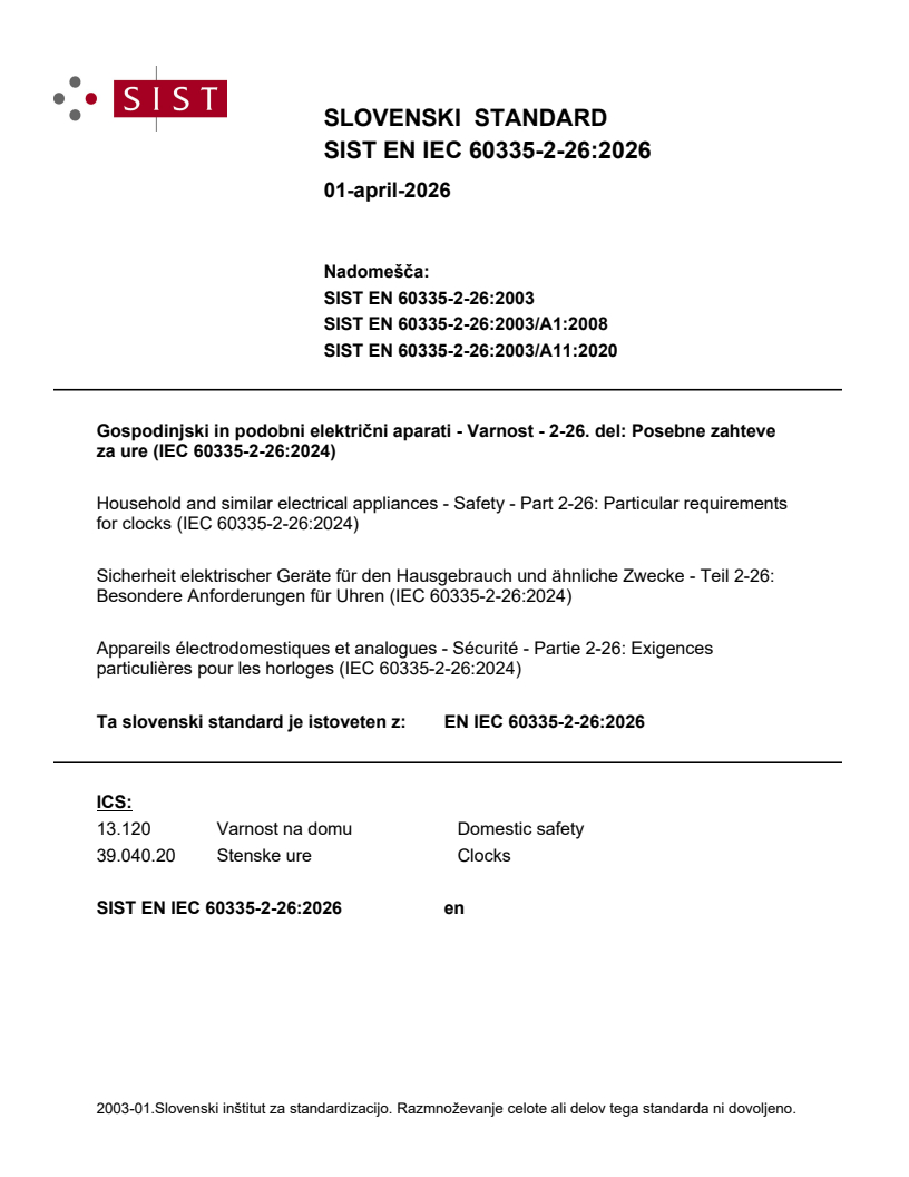 SIST EN IEC 60335-2-26:2026 is a standard published by the Slovenian Institute for Standardization (SIST). Its full title is "Household and similar electrical appliances - Safety - Part 2-26: Particular requirements for clocks (IEC 60335-2-26:2024)". This standard covers: This European standard deals with the safety of electric clocks having a rated voltage not more than 250 V including direct current (DC) supplied appliances and battery-operated appliances.