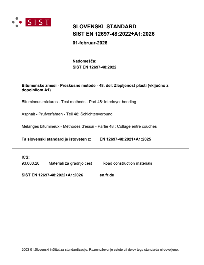 SIST EN 12697-48:2022+A1:2026 is a European standard developed by CEN, specifying test methods to determine the interlayer bonding strength of bituminous mixtures in road and airfield pavements. The bond strength between an asphalt layer and underlying layers or substrates is critical for pavement durability, performance, and safety. This standard provides reliable, repeatable testing protocols suitable for both laboratory samples and in situ pavement assessments. It covers multiple test methods designed to measure bond strength under different conditions and layer thicknesses.