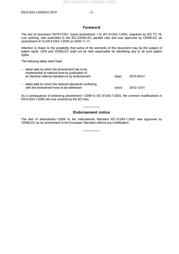 This amendment A1 modifies the European Standard EN 61243-1:2005; it was approved by CENELEC on